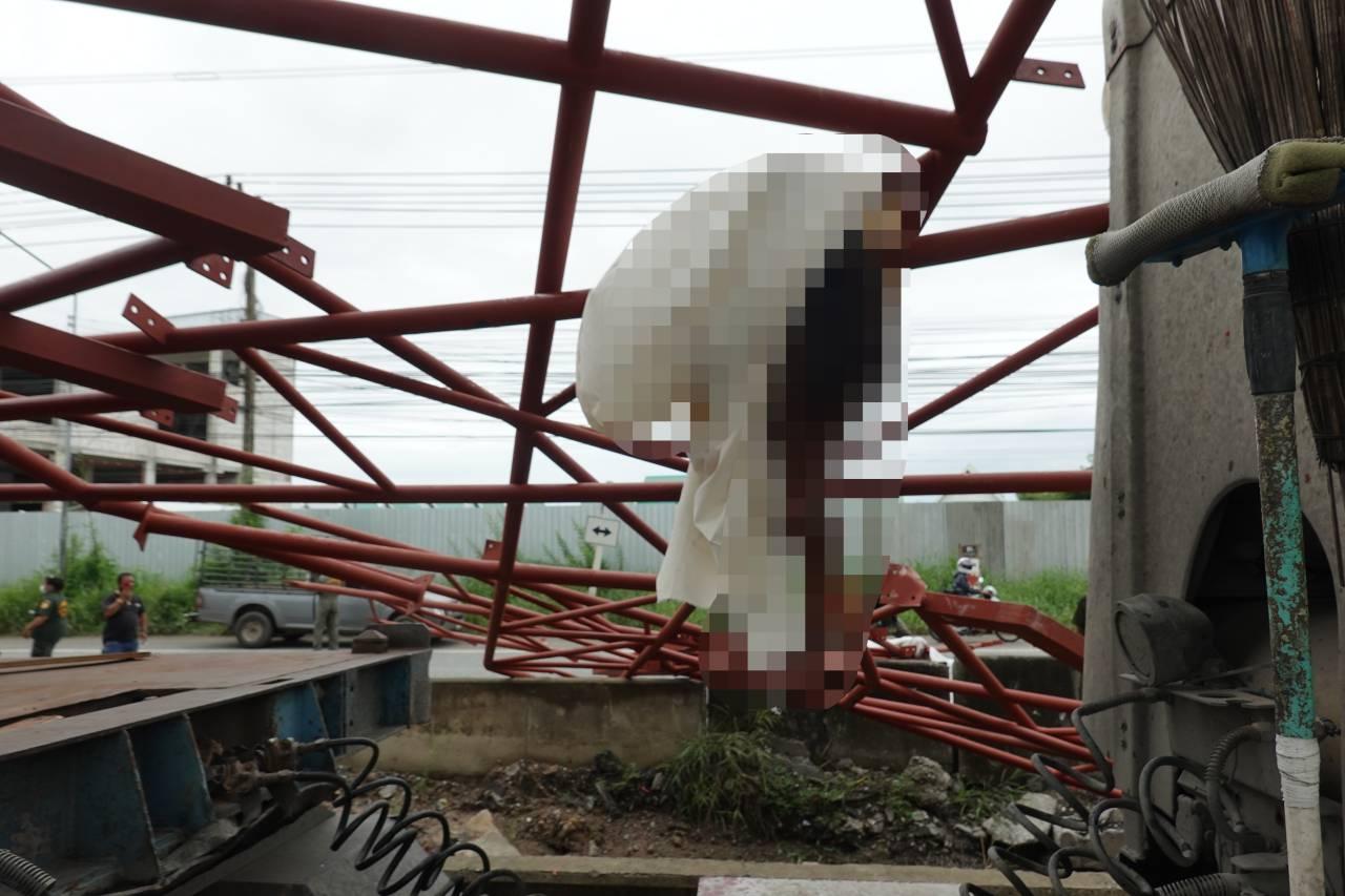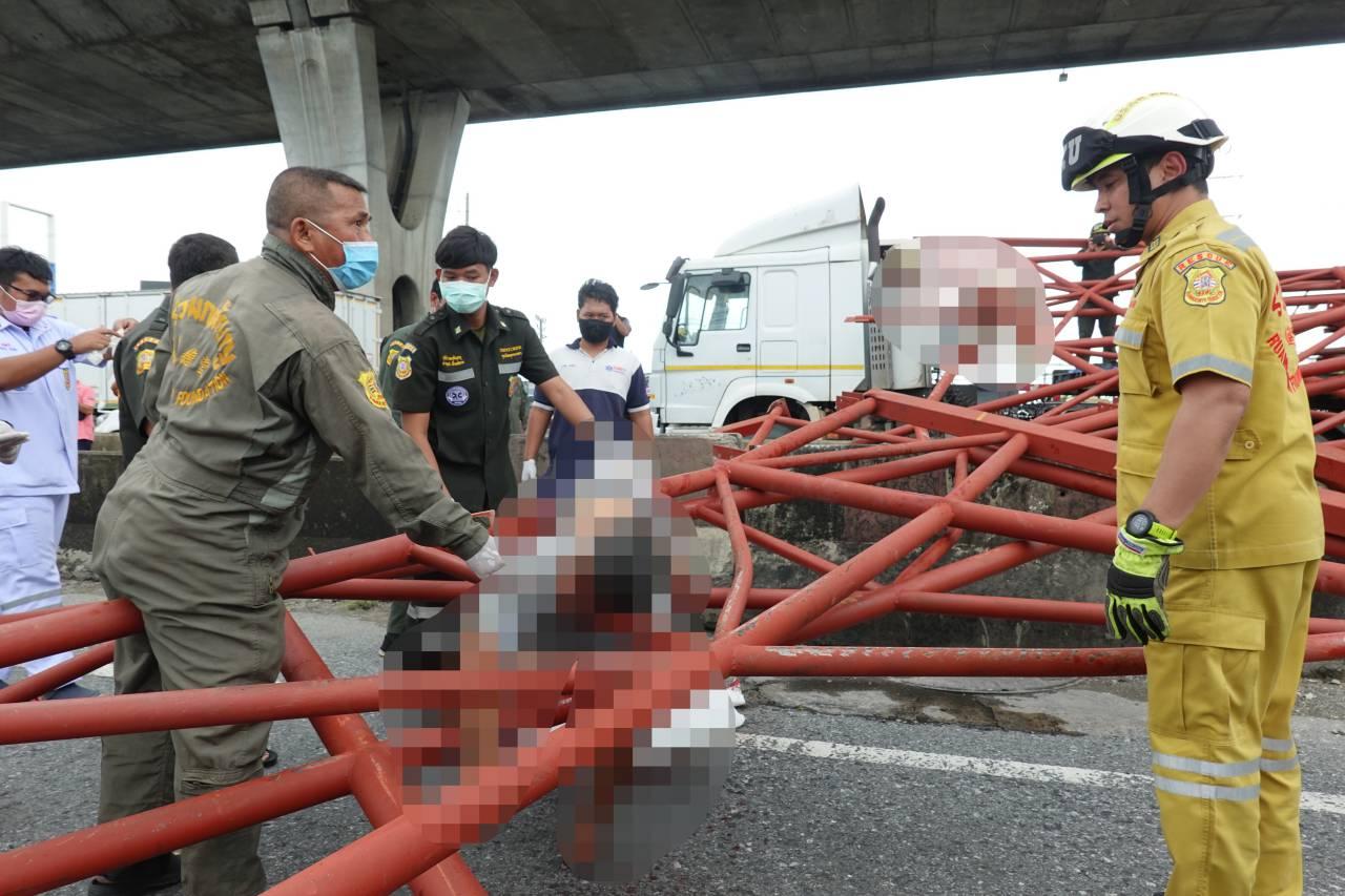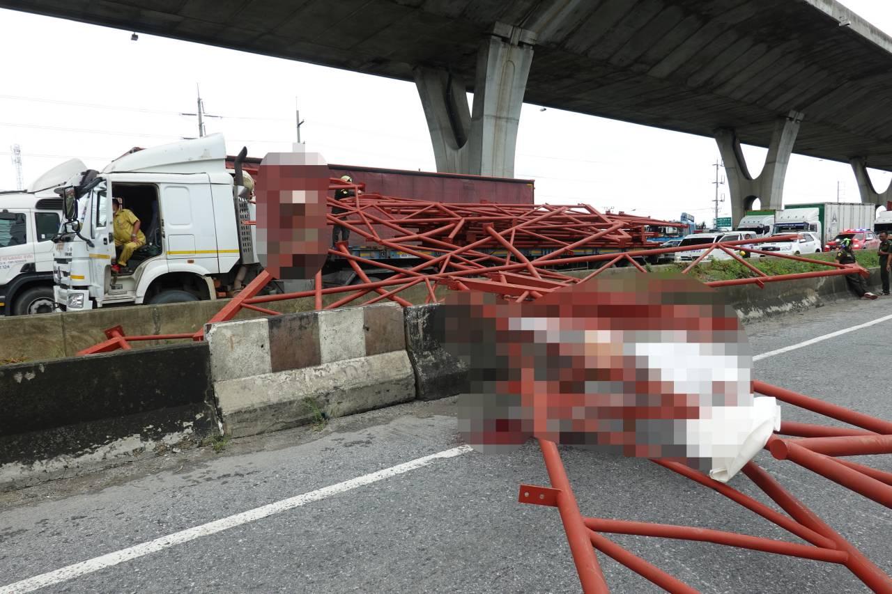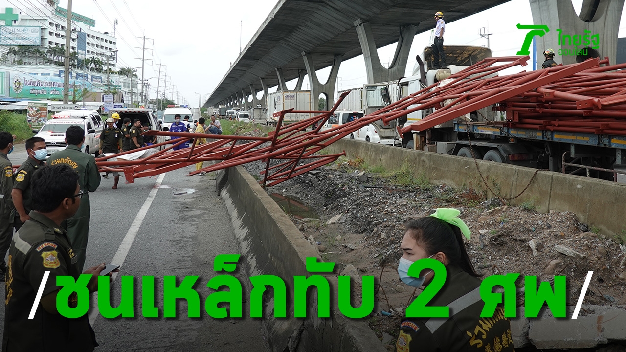 ชนสยอง 2 ผัวเมียขึ้นไปผูกโซ่รัดโครงเหล็กบนรถบรรทุก แล้วมีรถ 6 ล้อหลบไม่ทันเฉี่ยวโดนเหล็กที่ยื่นมา ทำให้โครงเหล็กไหลทับร่างตายคาที่ 2 ศพริมถนนเทพรัตน ย่านบางบ่อ จ.สมุทรปราการ
