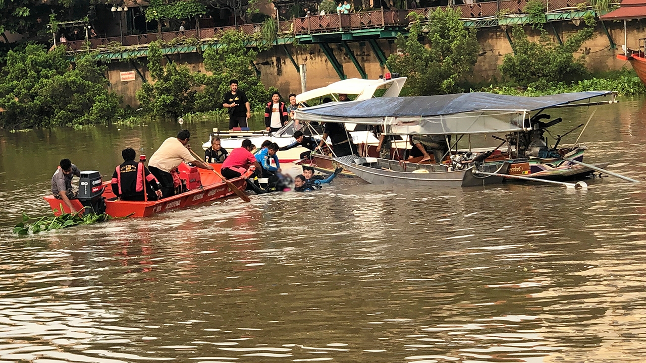 เจ้าหน้าที่เข้าช่วยนักท่องเที่ยว หลังประสบอุบัติเหตุเรือหางยาวชนกับเรือเหล็ก กลางแม่น้ำป่าสัก ใกล้สะพานปรีดีธำรง อ.พระนครศรีอยุธยา กระเด็นตกน้ำลอยคอ ขอความช่วยเหลือ ส่วนนายไชยยันต์ เงินแถบ จนท.ปภ.เทศบาลเมือง อโยธยา ที่นั่งเรือไปตกปลา จมน้ำเสียชีวิต.