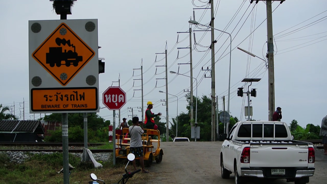ผู้นำชุมชนบางเตย นำเครื่องกั้นทาง ป้ายหยุดตรวจ มาตั้งที่จุดลักข้ามทาง หลังเกิดอุบัติเหตุรถไฟชนขบวนรถบัสคณะกฐิน มีผู้เสียชีวิต 19 ศพ โดยมีจนท.ของรถไฟคอยยืนโบก ขณะที่ประกันสังคมแจ้งสิทธิ์ผู้บาดเจ็บ