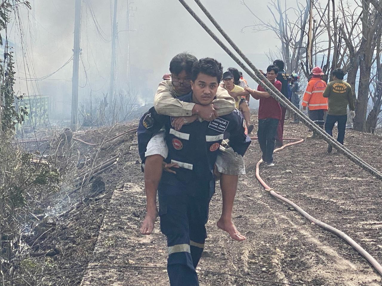 การช่วยเหลือเป็นไปด้วยความยากลำบาก ก่อนจะให้ปีนกำแพงหลังบ้านหนีตายออกมา โดยถูกไฟคลอกตามร่างกาย จากนั้นมีคนวิ่งมาเรียกกู้ภัยไปช่วยเหลือผู้ได้รับบาดเจ็บ จำนวน 9 คน ที่บางคนถูกแรงระเบิดจนร่างกระเด็น ถูกไฟคลอกไปครึ่งตัว หลบอยู่ในอาคารอเนกประสงค์ของในโรงเรียน เจ้าหน้าที่ต้องเร่งตัดลวดหนาม เพื่อลำเลียงคนเจ็บดังกล่าวออกจากจุดเกิดเหตุ