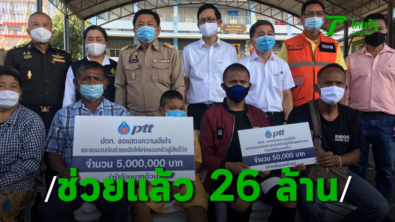 กรรมการผู้จัดการใหญ่ ปตท.มอบเงินช่วยเหลือผู้ได้รับผลกระทบเหตุการณ์ท่อก๊าซระเบิดที่บางบ่อ ผู้เสียชีวิต รายละ 5 ล้าน บาดเจ็บสาหัส 5 แสน รวมกว่า 26 ล้าน เป็นการช่วยเหลือเบื้องต้น โดยยังคงมีสิทธิได้รับค่าสินไหมทดแทนจากบริษัทประกันภัยตามกฎหมาย