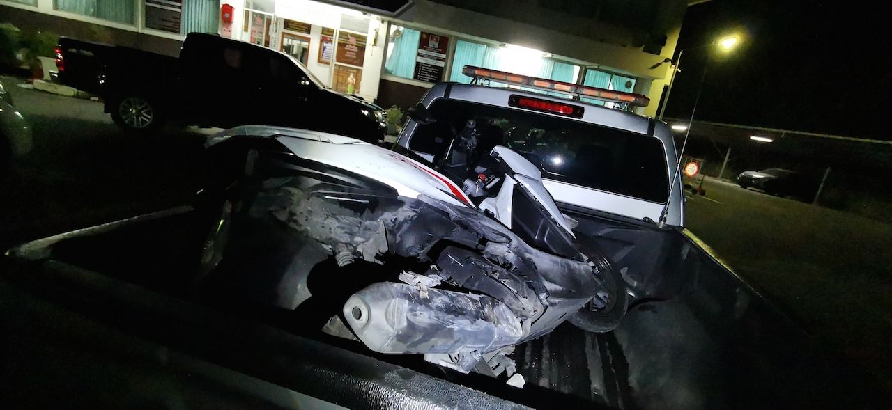 เมื่อถึงที่เกิดเหตุ พบรถจักรยานยนต์ ฮอนด้าคลิ๊ก 125 สีขาว ทะเบียน 8กบ200 กทม มีรอยถูกเฉี่ยวชนที่ด้านขวา ผู้ขับขี่ชื่อนาย ธนพล พรหมมหากุล 23 ปี ได้รับบาดเจ็บ นำส่ง รพ.เกษมราษฏร์รัตนาธิเบศร์ ไปแล้ว จยย.ยังไปกระแทกกับรถกระบะ อีซูซุ สีดำ ทะเบียน บบ7789 นนทบุรี ซึ่งมีรอยถูกชนที่ท้ายรถ กันโครนด้านซ้ายหัก และรถไหลไปชนรถกระบะ วีโก้ สีบรอนซ์เงิน ทะเบียน ศอ9748 กรุงเทพมหานคร ได้รับความเสียหายอีก 1 คัน