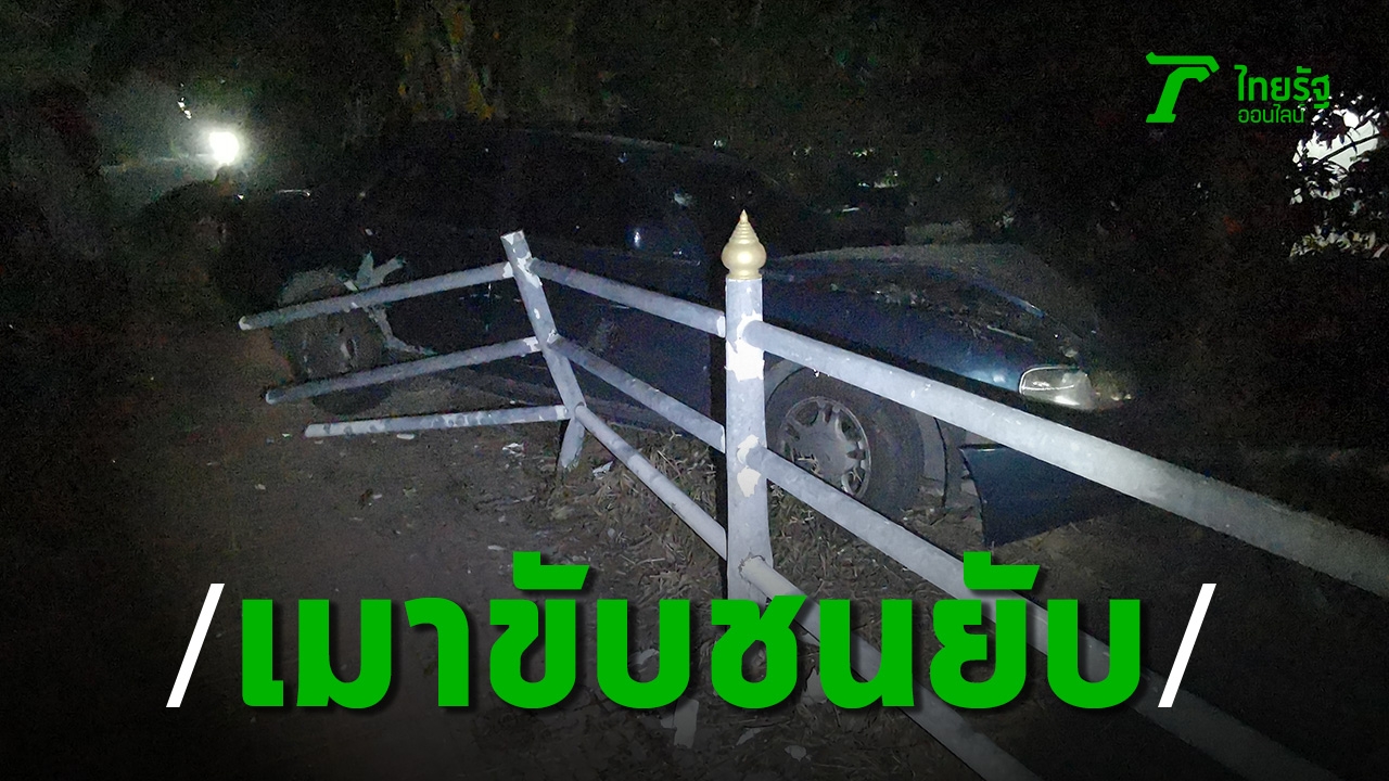 หนุ่มวัย 25 ปีเมาขับรถเก๋งชนจักรยานยนต์ล้มบาดเจ็บ จากนั้นพยายามขับหนีแต่ไปไม่รอด รถชนกับราวกั้นทางเดินพังยับ