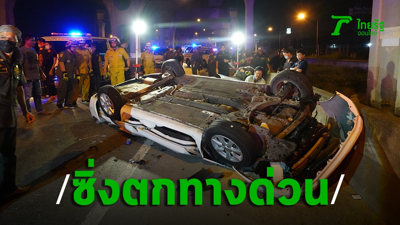 เก๋งซิ่งเลยแยกเบี่ยงลงทางด่วน หักเลี้ยวกะทันหัน ไม่พ้นชนแบริเออร์ พุ่งตกทางด่วน หงายท้องล้อชี้ฟ้า หลังคาพังยุบ หนุ่มคนขับดับสนิทคาซาก