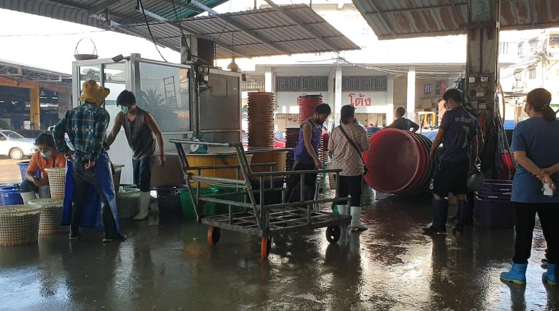 สำหรับบรรยากาศของตลาดกลางกุ้งจังหวัดสมุทรสาครในเช้าวันนี้ หลังจากที่เมื่อวานนี้ปิดตลาดมา 1 วัน ก็ได้เปิดค้าขายตามปกติ แต่ปรากฏว่าบรรยากาศค่อนข้างเป็นไปอย่างเงียบเหงาและซบเซากว่าที่ผ่านๆ มา เพราะนอกจากลูกค้าจะน้อยลงแล้ว เจ้าของบ่อที่นำกุ้งมาขายก็น้อยลง รวมถึงบรรดาพ่อค้าแม่ค้าในตลาดกุ้งก็น้อยลงด้วย เนื่องจากหลายคนกลัวโควิด-19 และยังไม่มั่นใจกับมาตรการในการป้องกันและควบคุมโรค อีกทั้งยังกลัวว่าหากผู้บริโภคทราบว่าสินค้ามาจากที่นี่ก็จะไม่กล้าซื้อไปบริโภคนั่นเอง.