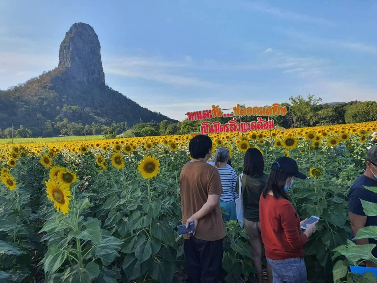 เมื่อวันที่ 21 ธ.ค.63 ผู้สื่อข่าวรายงานว่า ที่ จ.ลพบุรี นักท่องเที่ยวเดินทางมาชมความสวยสดงดงามของทานตะวัน ที่ “ทานตะวันปลอดมลพิษเป็นมิตรสิ่งแวดล้อม” เป็นทุ่งทานตะวันที่กำลังเริ่มผลิดอก แย้มความสวยให้เห็น ที่โลเกชั่นฉากหลังเป็นภูเขาสูงรูปร่างแปลกตา ที่ชาวบ้านเรียกกันว่า เขาจีนแล เขาเที่ยง หรือ เขาโด่ ซึ่งบรรดานักถ่ายภาพ นักท่องเที่ยวทั้งชาวไทยและต่างชาติ ขนานนามว่าทุ่งทานตะวันสวยสุดในประเทศไทย