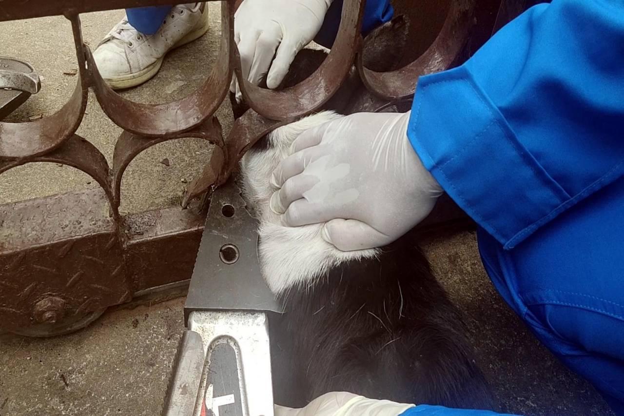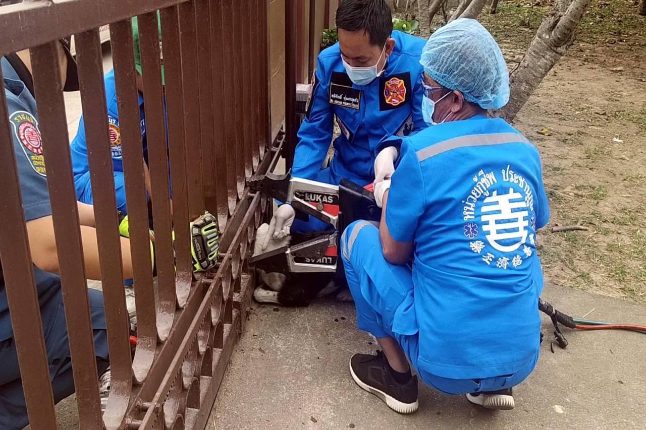 ทีมกู้ภัยราชบุรี ช่วยน้องหมาสีขาวดำ คอติดประตูเหล็ก พบอยู่ในสภาพอิดโรย คาดติดมาหลายชั่วโมง ต้องใช้เครื่องตัดถ่าง ด้านเจ้าของบ้านจะเอาไม้มาปิดด้านล่างประตูเหล็ก ป้องกันสุนัขซนมุดแล้วหัวติดอีก