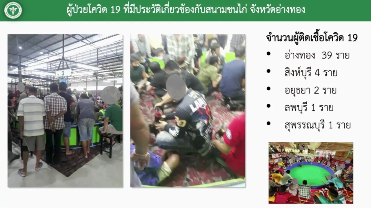 สธ. เผยคืบหน้ากรณีสนามชนไก่ จ.อ่างทอง ปัจจุบันติดเชื้อโควิด-19 กระจายต่อไปอีก 4 จังหวัด รวม 47 รายแล้ว แพทย์แนะคนมีประวัติ-คนสัมผัส กักตัวเองดูอาการ 14 วัน