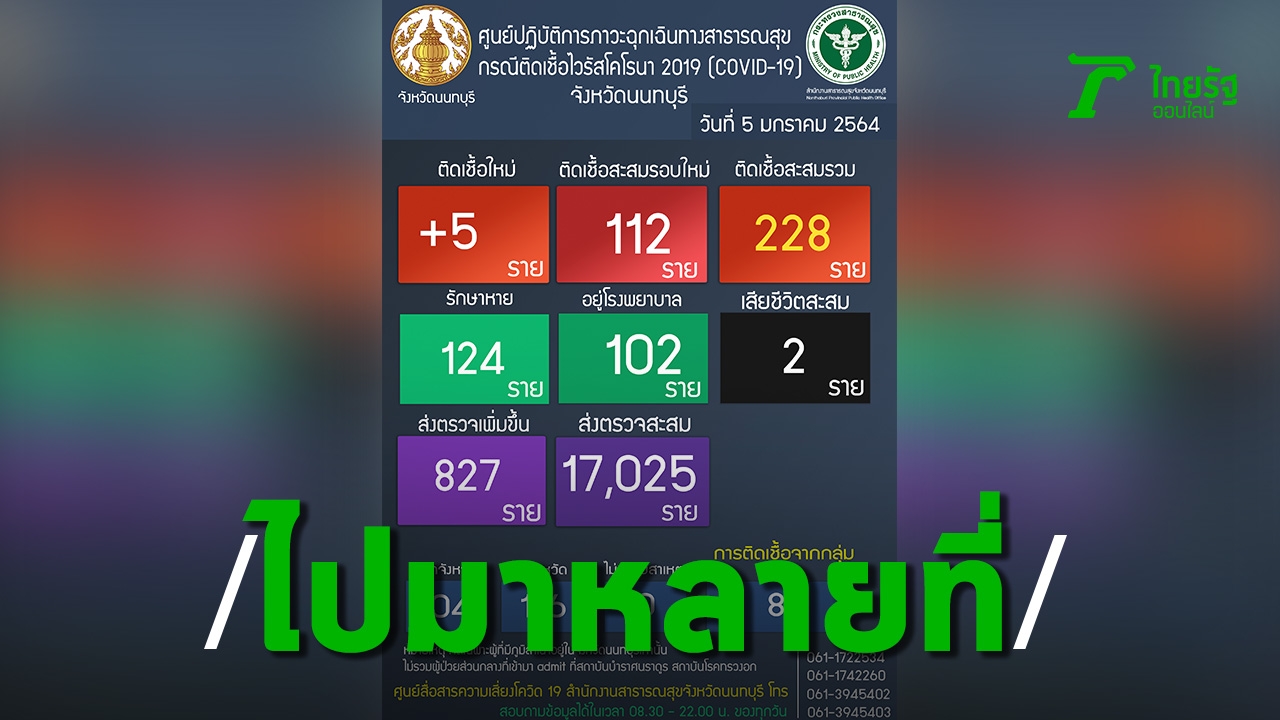 "นนทบุรี" ติดโควิดฯเพิ่มอีก 5 รวม 112 ราย "หนุ่มขายหวย" ขับรถให้เจ้าอาวาสวัดละหาร ติดเชื้อด้วย เผยไทม์ไลน์ไปมาหลายที่ ผู้สัมผัสเสี่ยงทั้งหมด 202 ราย