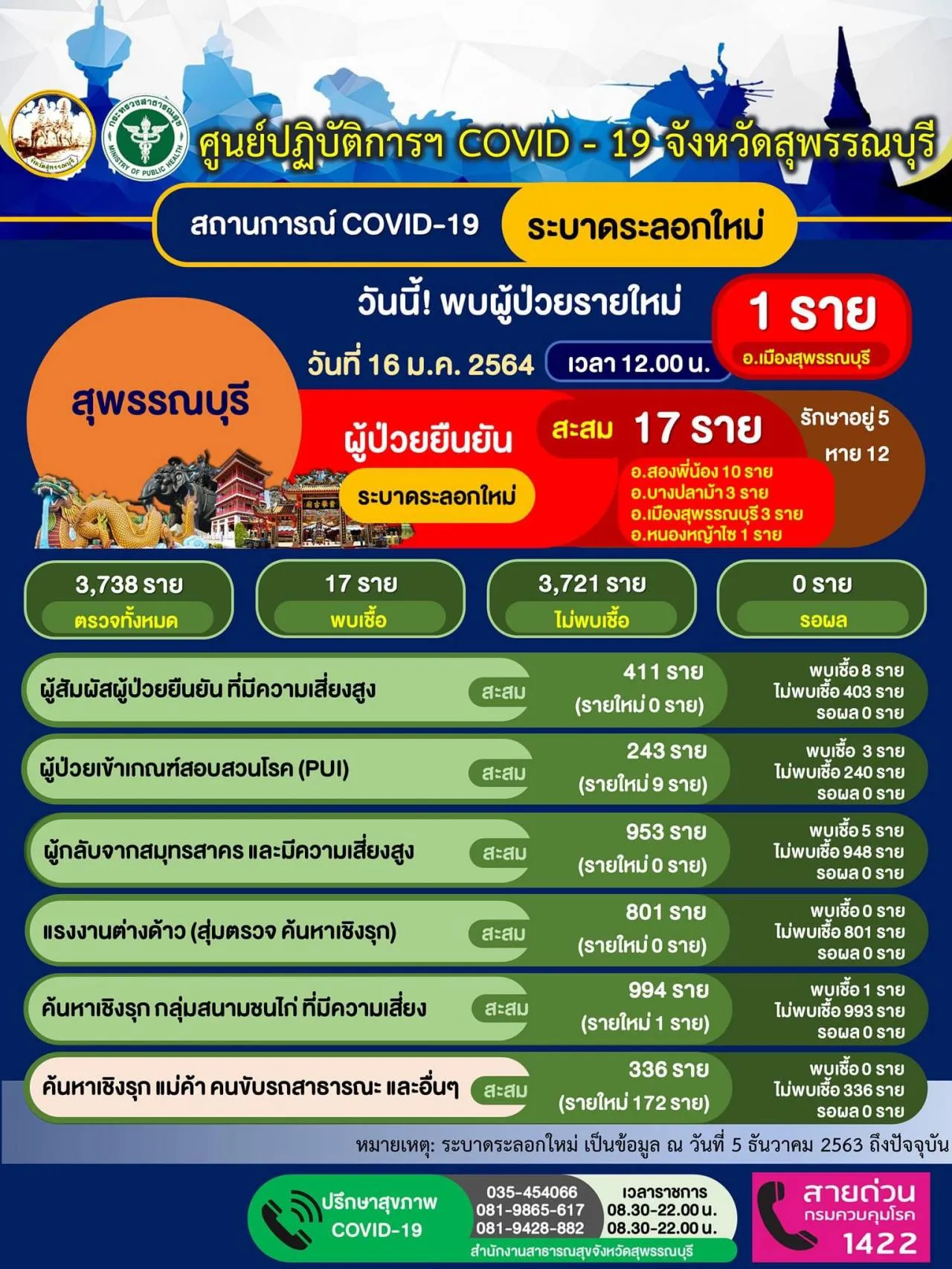เมื่อวันที่ 16 ม.ค.64 นายณัฐภัทร สุวรรณประทีป ผู้ว่าราชการจังหวัดสุพรรณบุรี เปิดเผยว่า มีการพบผู้ป่วยโควิด-19 รายที่ 17 ของการระบาดระลอกใหม่ โดยเป็นชายไทย อายุ 25 ปี ชาว อ.เมืองสุพรรณบุรี มีความเกี่ยวเนื่องสนามชนไก่ ซึ่งเป็นกลุ่มเสี่ยงสูงได้นำมากักตัวที่ ศูนย์กักตัวจังหวัดสุพรรณบุรี (LSQ สุพรรณบุรี) กระทั่งตรวจยืนยันพบป่วยเป็นโควิด-19 ในวันที่ 15 ม.ค. โดยมีไทม์ไลน์ดังต่อไปนี้