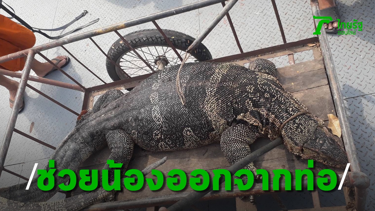 พระวัดบางพูนคิดว่างูเหลือมติดท่อน้ำทิ้ง เรียกดับเพลิง ทต.บางพูน ช่วยจับ ที่แท้ตัวเงินตัวทองอย่างใหญ่ หนักกว่า 200 กก. ต้องเจาะพื้นคอนกรีตช่วยออกมาได้สำเร็จ ก่อนใส่รถเข็นพาน้องไปส่งคลองบางพูน