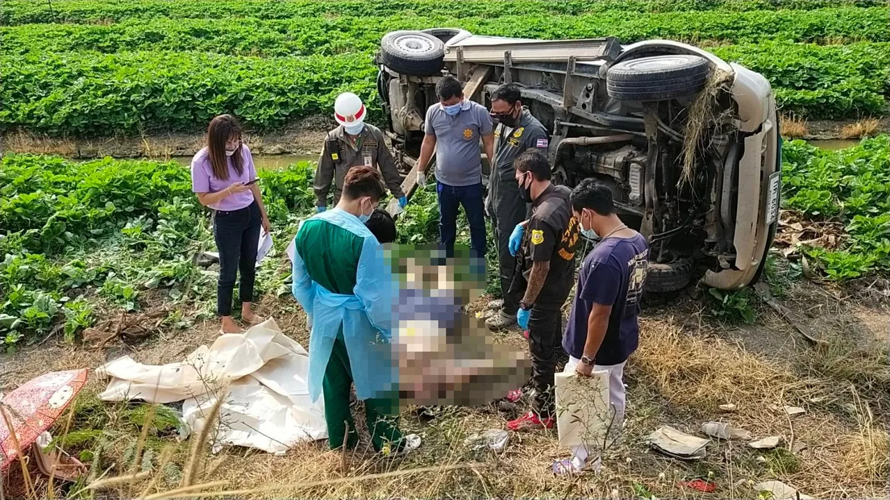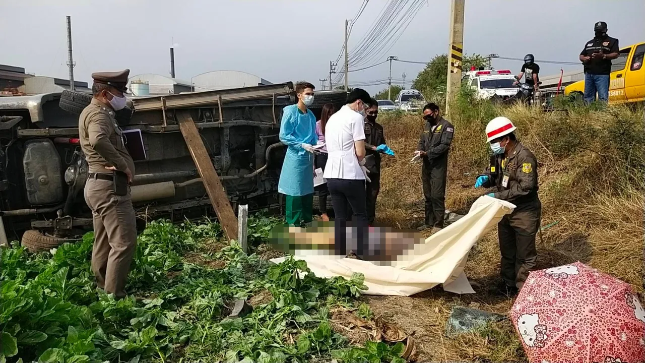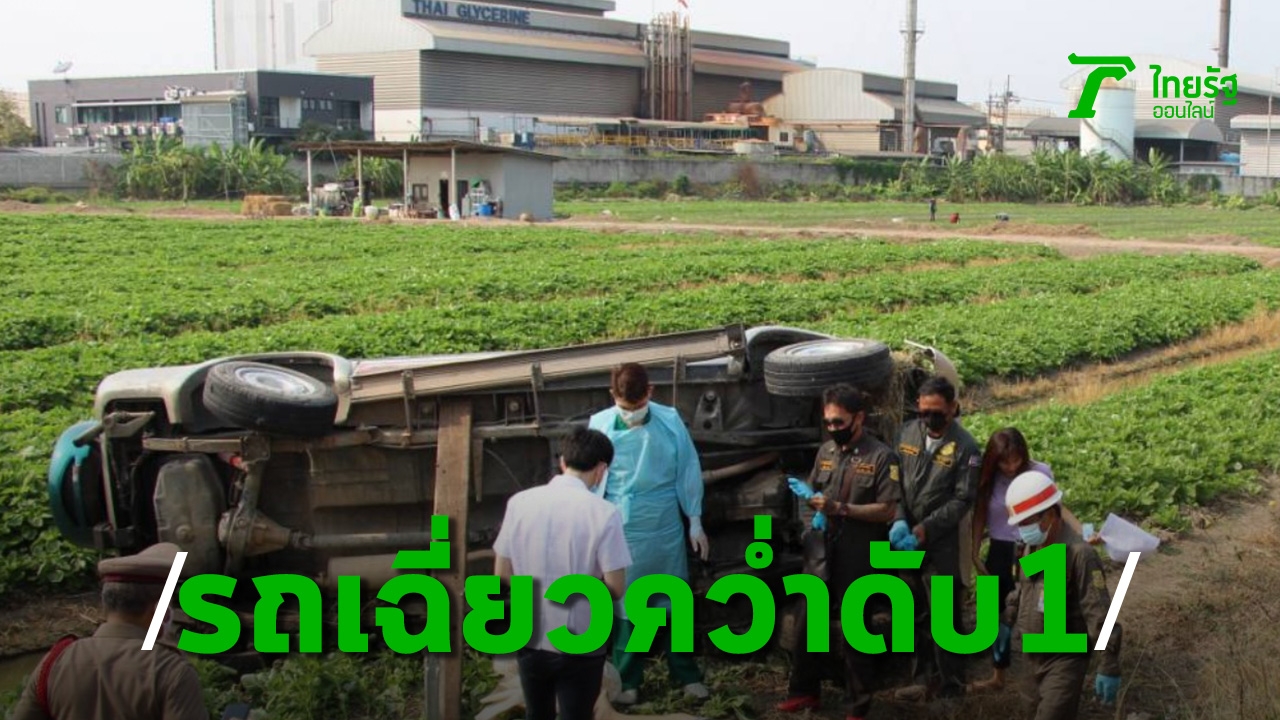 รถเอสยูวีขับมาทางตรง เจอรถบรรทุกไปรษณีย์ออกมาจากซอยแบบกระชั้นชิด หักหลบไม่พ้น เฉี่ยวจนเสียหลัก ก่อนพุ่งลงข้างทางริมถนนเลียบคลองแนวลิขิต อ.กระทุ่มแบน ร่างคนขับหลุดออกมาถูกรถกลิ้งทับตายคาที่