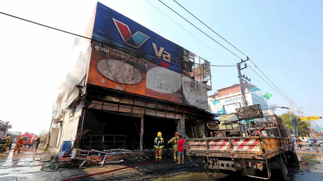 ไฟไหม้รถบรรทุกกรมทางหลวงชนบทปทุมธานี เปลวไฟลุกลามไป ติดสายไฟกระเด็นเข้าร้านขายอะไหล่รถ 3 คูหา สินค้าภายในร้านมอดไหม้ไปกับกองเพลิง เสียหายไปกว่า 50 ล้านบาท ขณะที่คนขับรถบรรทุกแจ้งพาลูกน้องมาตีเส้นจราจร เมื่อเสร็จงานเตรียมเก็บกรวยยาง แต่เกิดไฟลุกไหม้แบตเตอรี่รถช่วยกันดับไม่ทัน