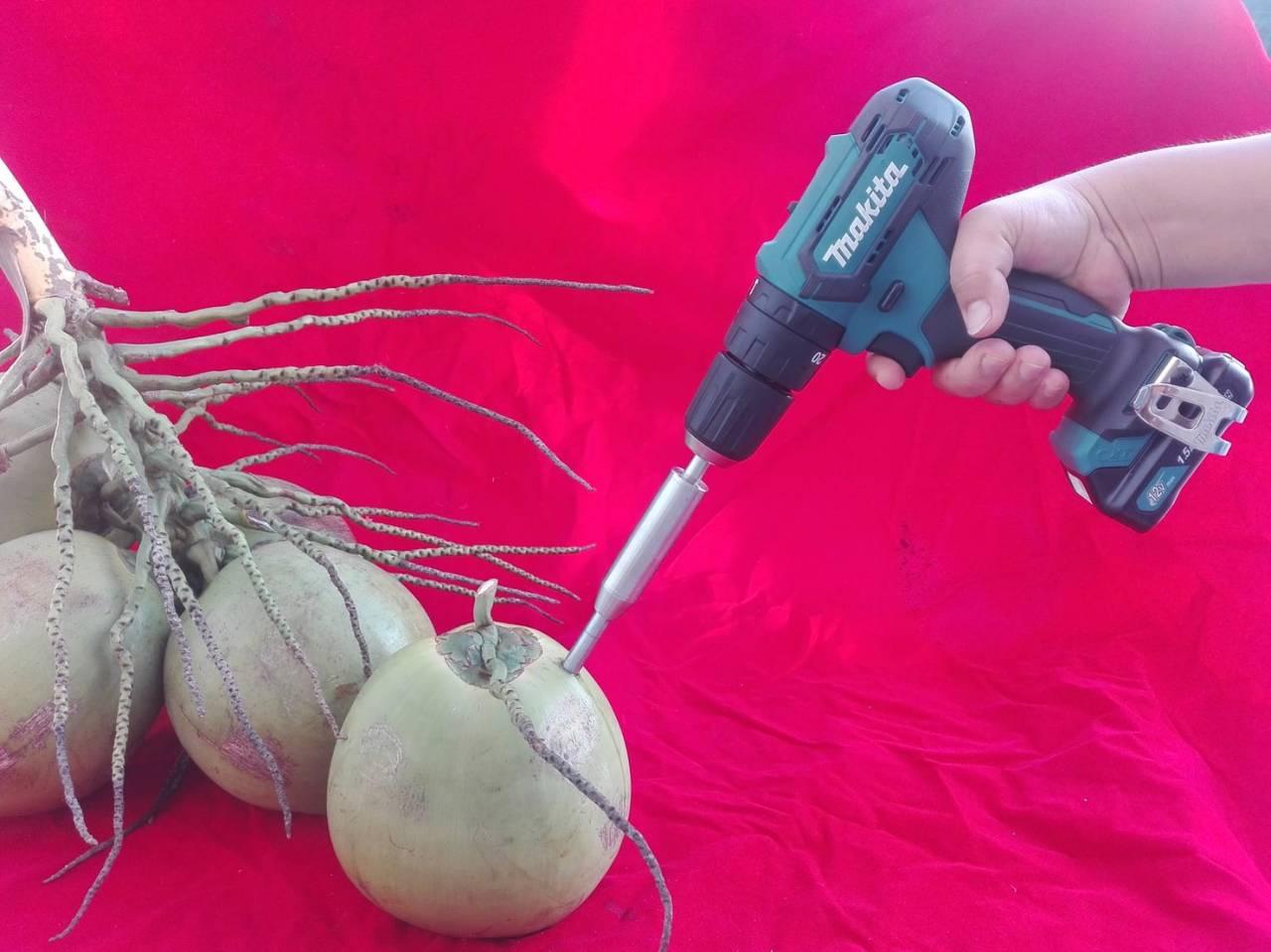 "อุปกรณ์ต้นแบบที่นักศึกษาผลิตเป็นงานแฮนด์เมด แต่สามารถนำไปผลิตในภาคอุตสาหกรรมได้ เนื่องจากเจาะมะพร้าวอ่อนได้รวดเร็ว 3 วิธี โดยใช้คู่กับสว่านไฟฟ้าแบบมือถือ ใช้มือหมุนกด หรือใช้มือกระแทก เมื่อเจาะแล้วสามารถเก็บเศษชิ้นส่วนจากเปลือกมะพร้าวไว้ได้ การใช้งานมีความรวดเร็ว สะดวก ปลอดภัย พกพาสะดวก ช่วยในการผ่อนแรง ลดค่าใช้จ่ายจากการผ่ามะพร้าวแบบเดิม สามารถนำไปประกอบอาชีพได้อย่างมีประสิทธิภาพ" หัวหน้าแผนกวิชาช่างกลโรงงาน วิทยาลัยการอาชีพบางสะพาน กล่าว