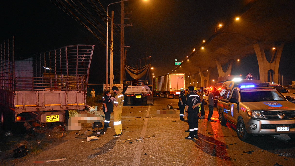 ที่เกิดเหตุพบรถบรรทุก 6 ล้อ ฮีโน่ สีขาว ทะเบียน 70-9623 สมุทรสาคร สภาพท้ายรถยุบ ด้านหน้ารถพังยับชนอัดติดรั้วกำแพงโรงงาน ด้านข้างรถพบผู้เสียชีวิต 2 ศพ ทราบชื่อนายวิโรจน์ คงแหลม อายุ 25 ปี อยู่บ้านเลขที่ 5/14 หมู่ 7 ต.คลองมะเดื่อ อ.กระทุ่มแบน จ.สมุทรสาคร และนายชัยลักษณ์ สมนึก อายุ 24 ปี อยู่บ้านเลขที่ 82/4 หมู่ 1 ต.ตองปิด อ.น้ำเกลี้ยง จ.ศรีสะเกษ ห่างกันเล็กน้อยพบรถพ่วง 18 ล้อ ตัวถังด้านหน้าพังยับเยิน มีนายต้น ฉายา อายุ 35 ปี เป็นคนขับ นอกจากนี้ยังมีรถบรรทุก 6 ล้อ ถูกชนท้ายอีก 1 คัน
