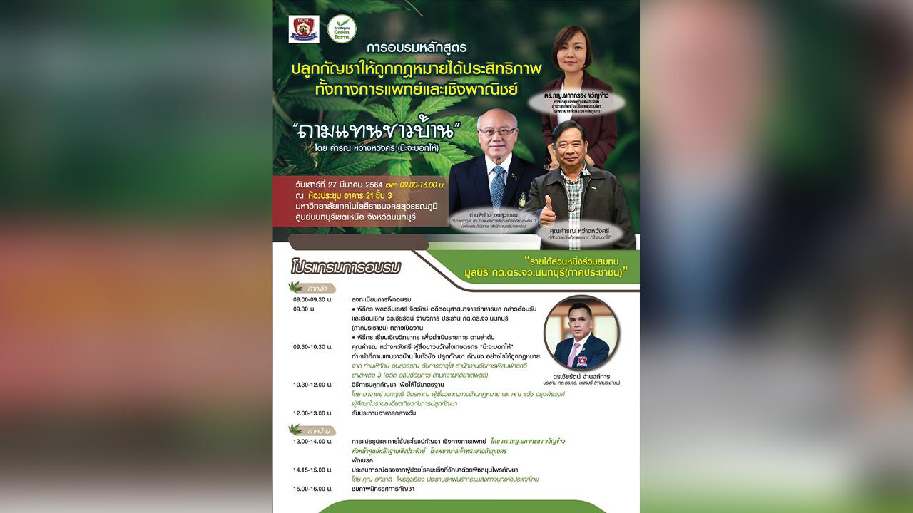 เมื่อวันที่ 25 มี.ค.64 ดร.ชัยรัตน์ จำนงค์การ ประธาน กต.ตร.จว.นนทบุรี ภาคประชาชน ร่วมกับวิสาหกิจชุมชน Green Farm โดยนายธวัช จรุงพิรวงศ์ เตรียมเปิดการอบรมหลักสูตร "ปลูกกัญชาให้ถูกกฎหมายได้ประสิทธิภาพทั้งทางการแพทย์และเชิงพาณิชย์" โดยมีไฮไลต์สําคัญทั้งการให้ความรู้เรื่อง "การปลูกกัญชา กัญชงอย่างไรให้ถูกกฎหมาย" โดยมี นายคํารณ หว่างหวังศรี อดีตพิธีกรคนดัง "นะจะบอกให้" ที่จะมาถามคําถามแทนชาวบ้าน โดยมีหัวข้ออบรม "วิธีการปลูกกัญชา เพื่อให้ได้มาตรฐาน" จากท่านอธิบดีอัยการอาวุโส พิทักษ์ อบสุวรรณ สำนักงานอัยการพิเศษฝ่ายคดียาเสพติด 3 และคุณธวัช จรุงพิรวงศ์ ผู้ศึกษาในรายละเอียดเกี่ยวกับการปลูกกัญชา