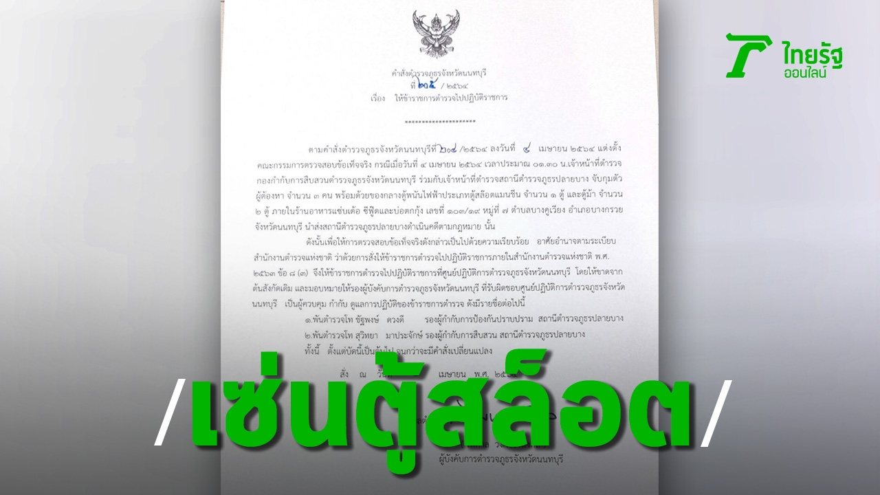 ผู้การนนท์เซ็นเด้ง 2 นายตำรวจ สภ.ปลายบาง ยศ "พ.ต.ท." เซ่นบ่อตกกุ้งแอบตั้งตู้สล็อตเล่นพนัน ยึดตู้สล็อตแมชชีน 1 ตู้ม้า 2 ตู้ รวบ "เจ้าของร้าน-คนดูแล" อ้างเพิ่งลงได้ไม่กี่วัน-หารายได้เสริมให้ร้าน