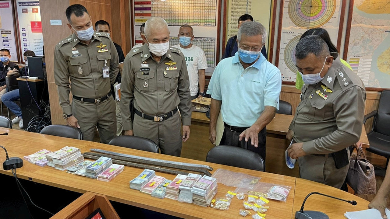 ตำรวจแกะรอยลากคอโจรงัดเซฟยึดทรัพย์สินได้คืนเกือบครบรายนี้ เปิดเผยขึ้นเมื่อเวลา 11.00 น. วันที่ 7 เม.ย. ที่ สภ.เมืองสมุทรปราการ พล.ต.ต.ชุมพล พุ่มพวง ผบก.ภ.จ.สมุทรปราการ พ.ต.อ.เติมรัศมิ์ จินดาวัฒน์ ผกก.สภ.เมืองสมุทรปราการ พร้อมฝ่ายสืบสวน สภ.เมืองสมุทรปราการ ร่วมกันแถลงจับกุมผู้ต้องหาร่วมกันลักทรัพย์ 3 คน ประกอบด้วย นายทวีศักดิ์ สุขประเสริฐ อายุ 48 ปี อยู่บ้านเลขที่ 61/236 ต.บางเมือง อ.เมืองสมุทรปราการ นายสินณพัฒน์ สุวรรณรัตน์ อายุ 54 ปี อยู่บ้านเลขที่ 554 หมู่ 3 ต.บางโปรง อ.เมืองสมุทรปราการ และนายสำรวย ภักดี อายุ 58 ปี โชเฟอร์รถสองแถวสายสำโรง-พระประแดง พร้อมของกลางธนบัตรไทยและธนบัตรต่างประเทศมูลค่าราว 9 ล้านบาท ไข่มุกและทองคำ นาฬิกา 2 เรือน รวมมูลค่าทรัพย์สินทั้งหมดเกือบสิบล้านบาท ชะแลงเหล็กที่ใช้ก่อเหตุ 3 อัน