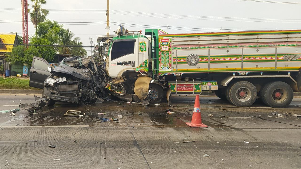 สอบถามนายสมยศ ชัยปรีชา อายุ 33 ปี คนขับรถบรรทุกพ่วง เผยว่ากำลังขับรถบรรทุกดินมาเต็มคันจะไปส่งแถววัดท่าไม้ สมุทรสาคร โดยขับมาเลนซ้าย ถึงที่เกิดเหตุ รถกระบะคู่กรณีเหินข้ามเกาะกลางถนนมาชนด้านหน้ารถตนอย่างแรง