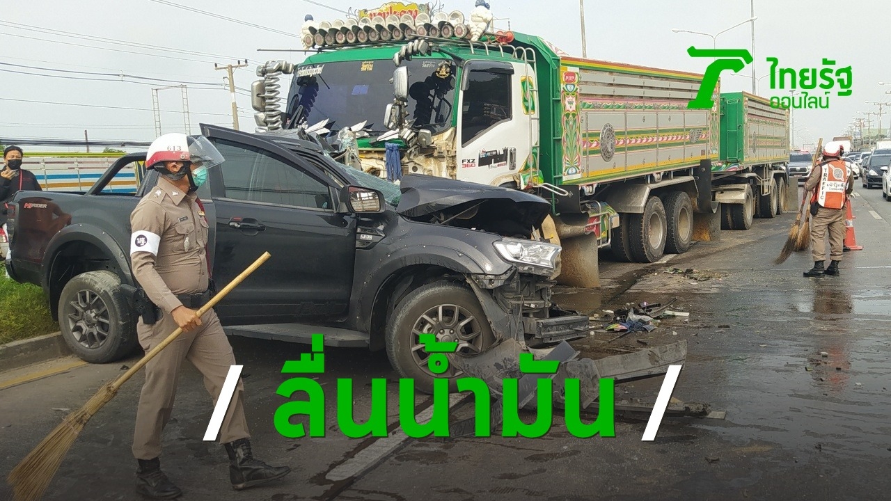 รถกระบะลื่นน้ำมันบนถนน เสียหลักเหินข้ามเกาะกลางชนประสานงารถพ่วง คนขับบาดเจ็บ ผู้หญิงนั่งคนขับอาการสาหัส นำส่ง รพ.ก่อนเสียชีวิตในห้องฉุกเฉิน โดยก่อนหน้านั้น มีจยย.เสียหลักลื่นล้มไปหลายคัน