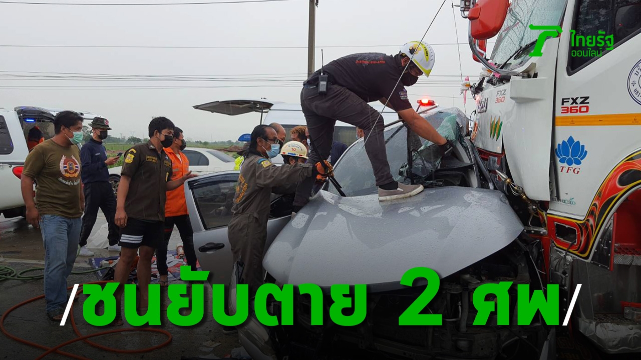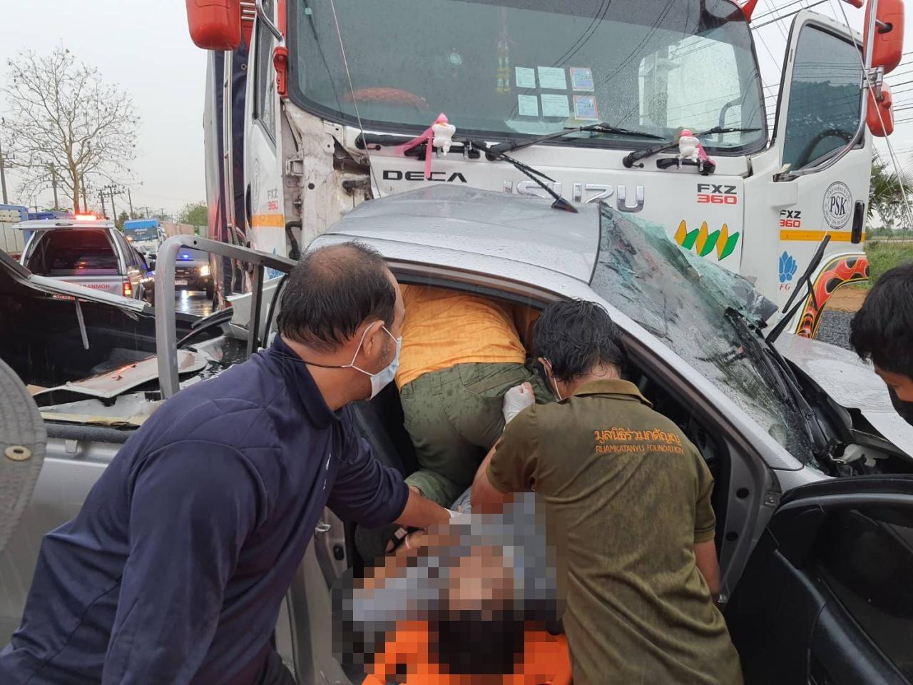 กระบะเสียหลักชนกับรถบรรทุกพ่วงบนถนนโพธิ์พระยา-ท่าเรือ พื้นที่ อ.บ้านหมอ จ.สระบุรี คนในกระบะเสียชีวิต 2 ศพ เผยกระบะแซงรถอีกคันมาแล้วเสียหลักหมุนมาชนลากไป 500 เมตร เพราะฝนตกถนนลื่นเบรกไม่อยู่