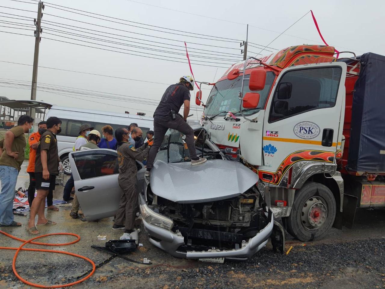 ในที่เกิดเหตุพบรถบรรทุกพ่วง ยี่ห้ออีซูซุ สีขาว ทะเบียนตัวแม่ 70-1362 พิจิตร ทะเบียนตัวลูก70-1363 พิจิตร ชนกับรถกระบะยี่ห้อโตโยต้า ตอนเดียว ใส่หลังคาแครี่บอย สีบรอนซ์เงิน ทะเบียน 1ฒภ9671 กทม. สภาพรถกระบะถูกชนเข้าด้านซ้ายพังยับ เศษอุปกรณ์รถกระจัดกระจายเต็มถนน และถูกลากยาวกว่า500เมตร ภายในรถยนต์กระบะมีผู้ติดอยู่จำนวน 2 ราย