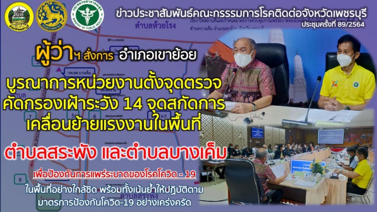ตามที่จังหวัดเพชรบุรีได้มีคำสั่งจังหวัดเพชรบุรี ที่ 790/2564 ลงวันที่ 20 พฤษภาคม 2564 ห้ามบุคคลเข้าไปหรือออกจากอาคารสถานที่เป็นการชั่วคราวและจัดตั้งจุดตรวจคัดกรองในพื้นที่ตำบลสระพังและตำบลบางเค็ม อำเภอเขาย้อย เพื่อตรวจคัดกรองพนักงาน แรงงาน และบุคคล ของบริษัทแคล-คอมพ์อิเล็คโทรนิคส์ (ประเทศไทย) จำกัด (มหาชน) นั้น