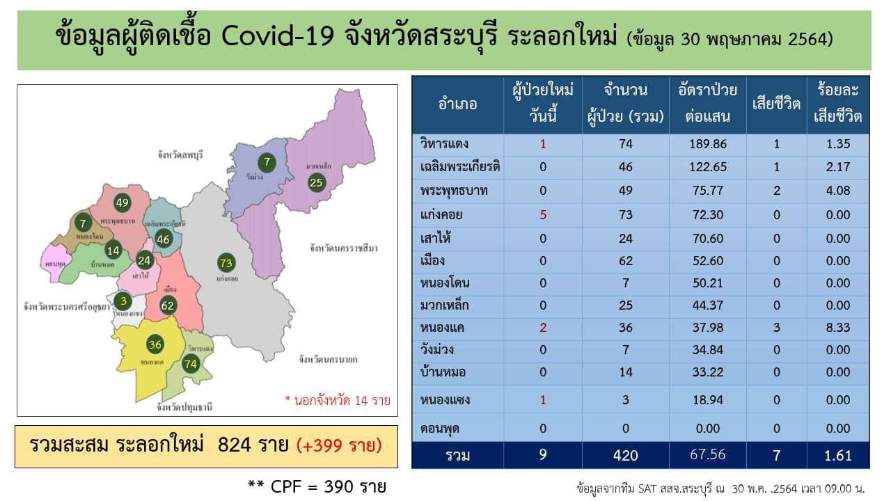 จากกรณี เมื่อวันที่ 30 พฤษภาคม 2564 สืบเนื่องจากมีการระบาดของโรคโควิด-19 โรงงานแปรรูปเนื้อไก่สระบุรี (บริษัท ซีพีเอฟ ประเทศไทย จำกัด (มหาชน)) สำนักงานสาธารณสุขจังหวัดสระบุรีดำเนินการตรวจคันหาผู้ป่วยเชิงรุกพนักงานโรงงานแปรรูปเนื้อไก่สระบุรี ซึ่งมีพนักงานรวมทั้งสิ้น 5,862 คน ปัจจุบันดำเนินการตรวจเชิงรุกแล้วจำนวน 3,400 คน ทราบผลการตรวจแล้ว จำนวน 2,299 คน พบผู้ติดเชื้อจำนวน 391 คน ในจำนวนนี้เป็นชาวกัมพูชา จำนวน 240 คน เป็นเพศชาย จำนวน 129 คน เพศหญิง จำนวน 111 คน ชาวไทย จำนวน 151 คน เป็นเพศชาย จำนวน 37 คน เพศหญิง จำนวน 114 คน อยู่ในจังหวัดสระบุรี จำนวน 349 คน (กัมพูชา จำนวน 240 คน ชาวไทย 109 คน) เดินทางไป-กลับต่างจังหวัด 42 คน (ชาวไทยทั้งหมด) ทางโรงงานชำแหละไก่ได้ทำการปิดสายการผลิตชั่วคราว จำนวน 5 วัน เริ่มตั้งแต่วันที่ 30 พฤษภาคม 2564 จนถึง 3 มิถุนายน 2564 แล้วจะทำการพ่นยาเพื่อทำความสะอาด
