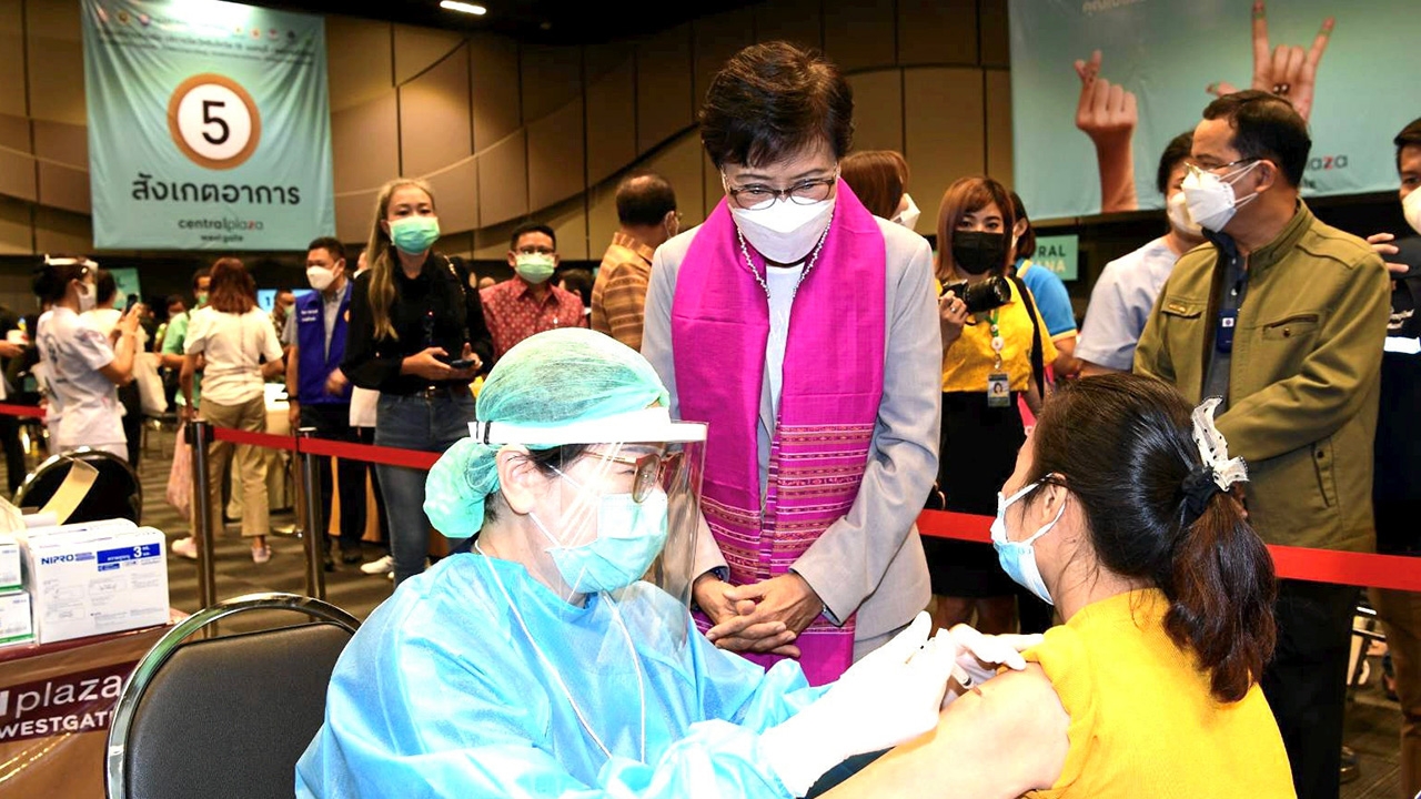 นางกัลยา โสภณพนิช รมช.ศึกษาธิการ พร้อมด้วยนายสุจินต์ ไชยชุมศักดิ์ ผวจ.นนทบุรี ตรวจเยี่ยม การฉีดวัคซีนป้องกันโรคโควิด-19 ที่ห้างสรรพสินค้าเซ็นทรัล เวสต์เกต อ.บางใหญ่ ที่เป็นการฉีดวัคซีนให้ครูและ บุคลากรทางการศึกษา 6 พันคน และ เจ้าหน้าที่ด่านหน้าอีก 1 พันคน เนื่องจาก สถานศึกษาบางส่วนจะเปิดเรียนแล้ว.