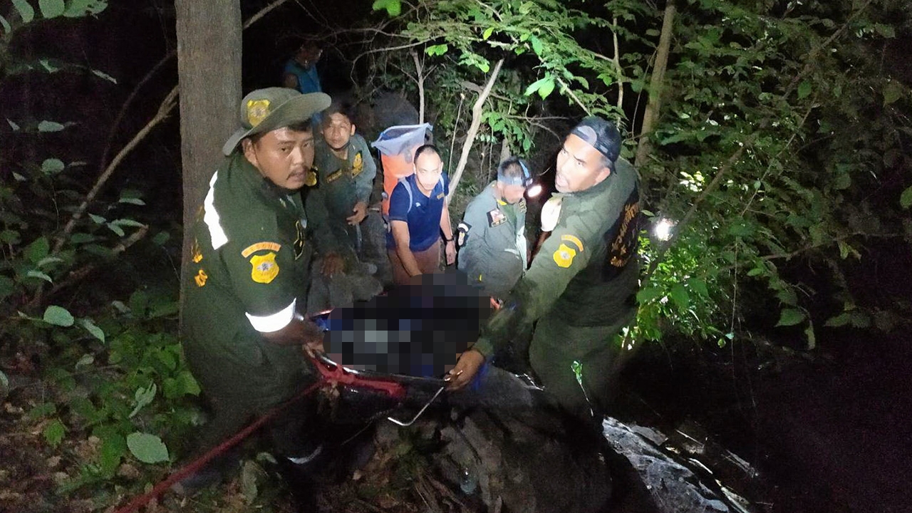 ที่เกิดเหตุอยู่บนหุบเขาเป็นป่าทึบและมีความชัน เจ้าหน้าที่เดินทางขึ้นไปตรวจสอบอย่างยากลำบาก ที่บริเวณใต้ต้นไม้เนินเขาพบศพ พ.อ.อ.ณฐพันธ์ จันทร์คีรี อายุ 50 ปี สังกัดอากาศโยธิน อยู่บ้านเลขที่ 250/89 หมู่ 11 ต.คูคต อ.ลำลูกกา จ.ปทุมธานี เป็นนักกีฬาเบส จัมปิ้ง สภาพสายร่มชูชีพพันร่าง กระดูกตามลำตัวหัก บริเวณกิ่งไม้พบร่มชูชีพมีสายระโยงระยาง จากนั้นเจ้าหน้าที่เคลื่อนศพใส่เปลหามออกมาจากป่ากันอย่างทุลักทุเลใช้เวลากว่า 2 ชม.
