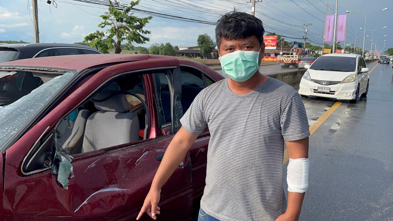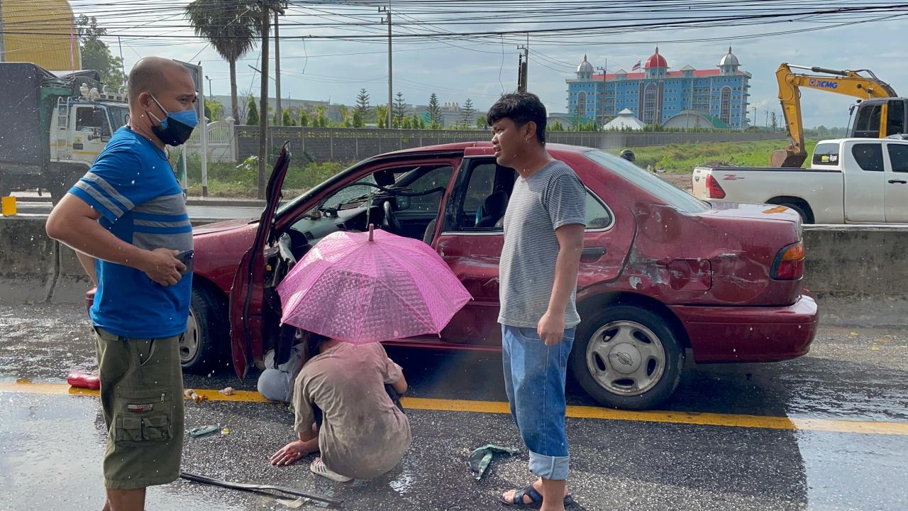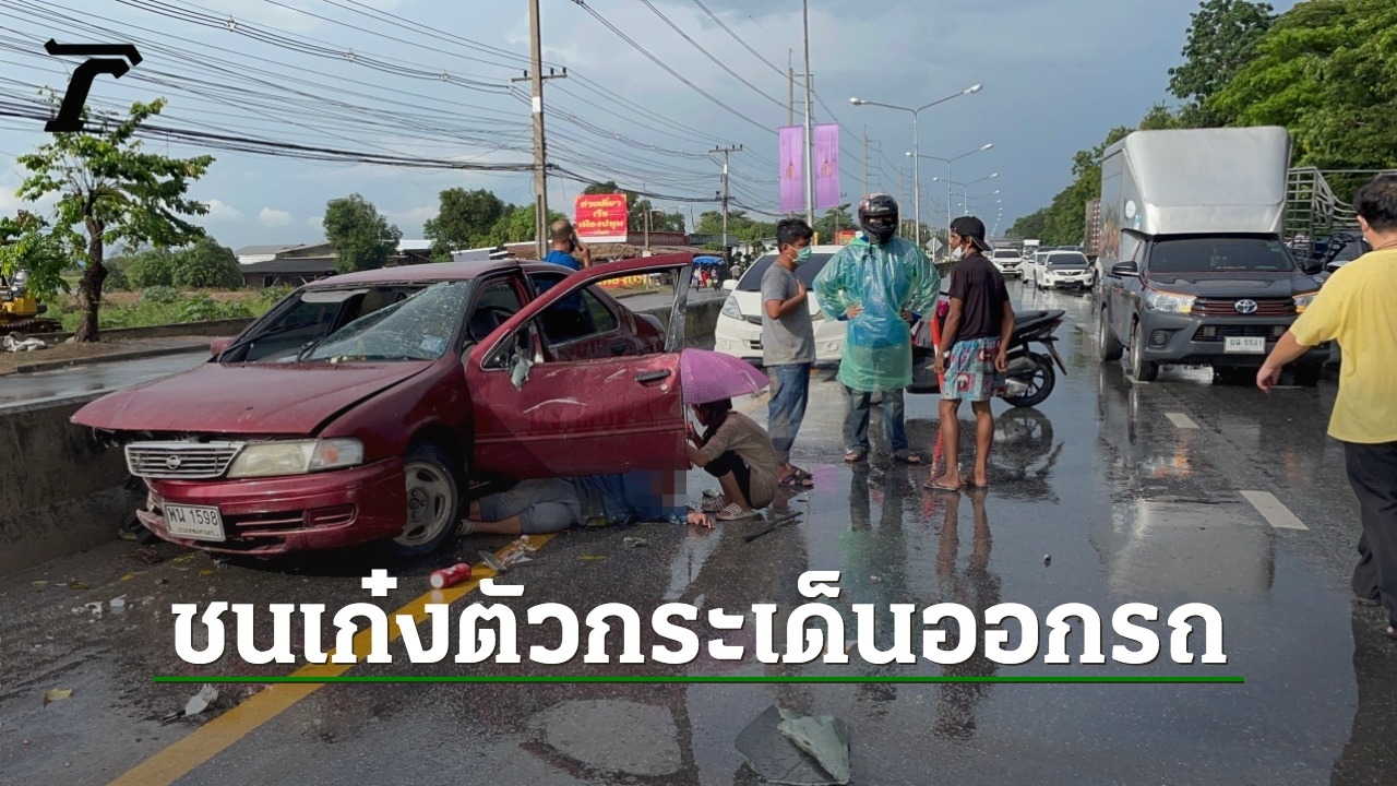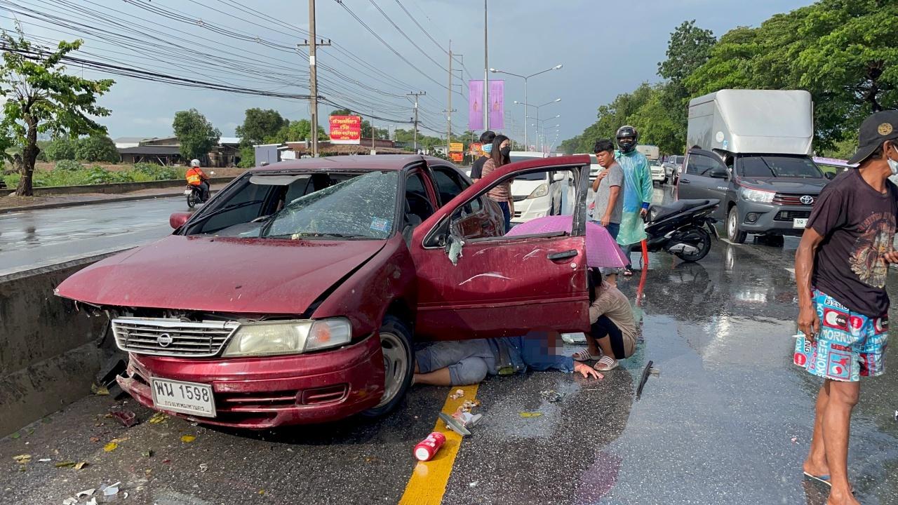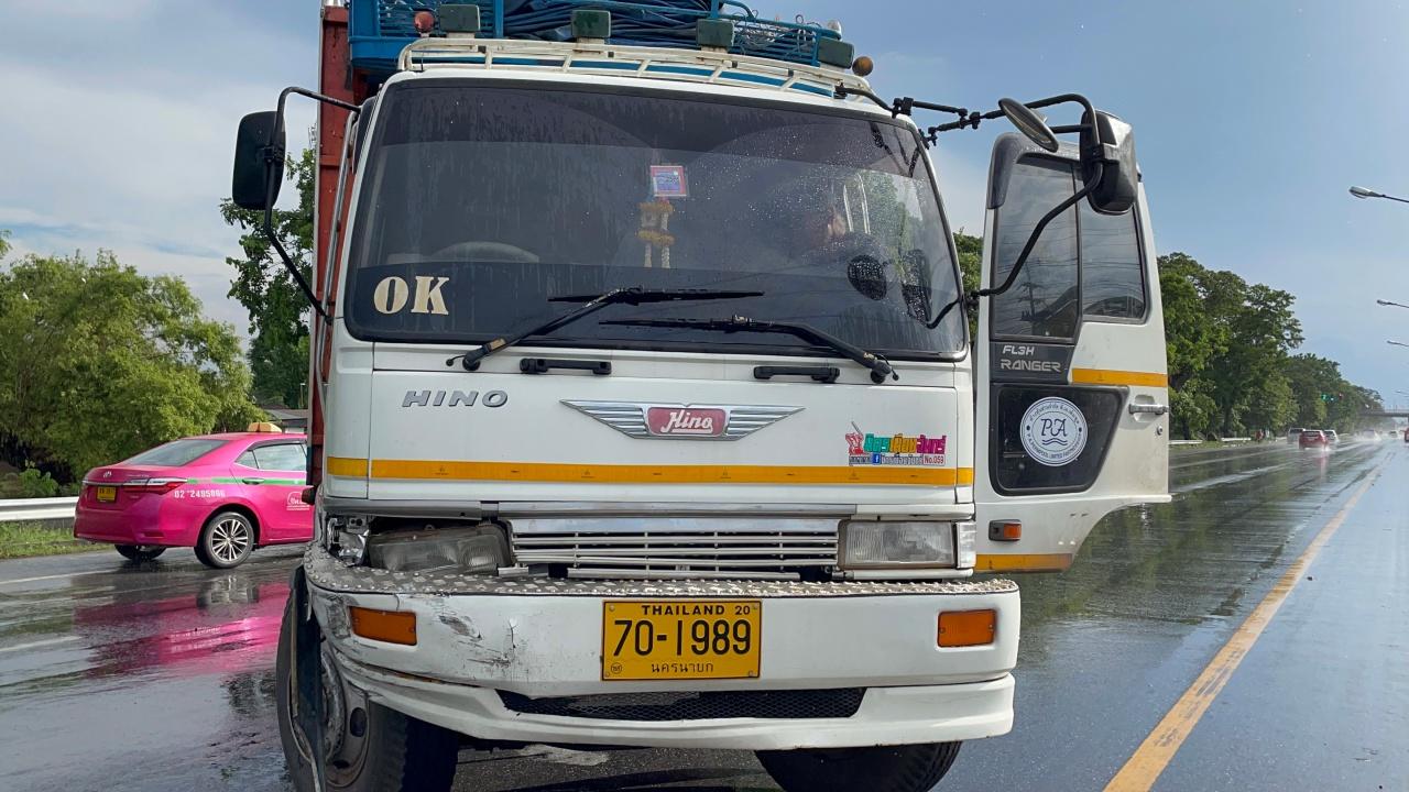 สิบล้อซิ่งฝ่าสายฝนชนเก๋งกระเด็นตรงแยกไฟแดงโรงพยาบาลมหาวชิราลงกรณ-ธัญบุรี จนป้าวัย 50 ที่นั่งมากระเด็นออกนอกรถบาดเจ็บ พยานบอกสิบล้อมาเร็วมากก่อนเบรกรถสะบัดไปชนเก๋งอัดแบริเออร์