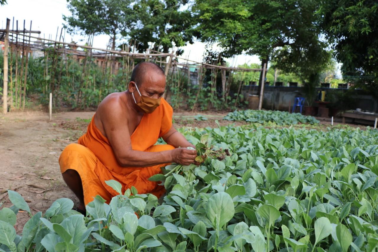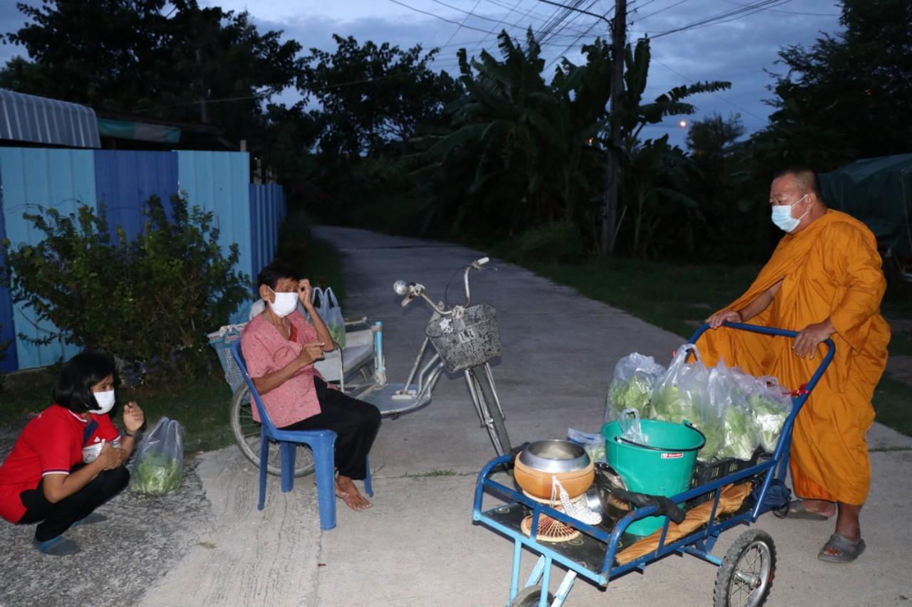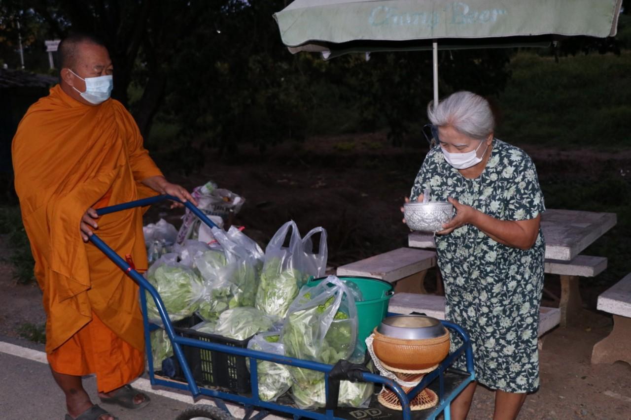 หลังจากญาติโยมทำการตักบาตร พระให้ศีลให้พรแล้ว พระก็จะนำผักสดนานาชนิดที่ปลูกเอง ส่งให้ญาติโยม แบ่งปันความสุข แจกจ่ายให้แก่ชาวบ้าน มานานกว่า 2 ปีแล้ว ประกอบกับช่วงโควิด-19 ระบาด ทางวัดก็ได้ปลูกผักเพิ่มเติม เพื่อให้ประชาชนผู้ที่ได้รับผลกระทบ บางวันก็ มีญาติโยมเดินทางมารับผักเองที่วัดถึงแปลงผัก เพื่อนำไปรับประทานกันภายในครอบครัว ลดค่าใช้จ่าย และในตอนเช้าพระสงฆ์ก็จะใช้รถเข็นที่เตรียมออกบิณฑบาต นำผักใส่รถเต็มคันรถแล้วเข็น ออกบิณฑบาตในตอนเช้า พร้อมนำผักแจกจ่ายปันสุขให้แก่ประชาชนในหมู่บ้านต่อไป.