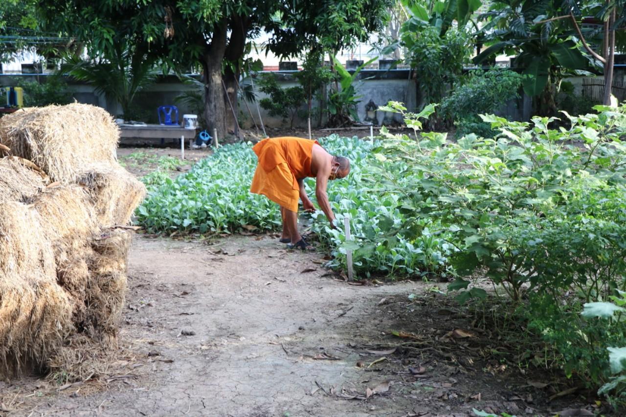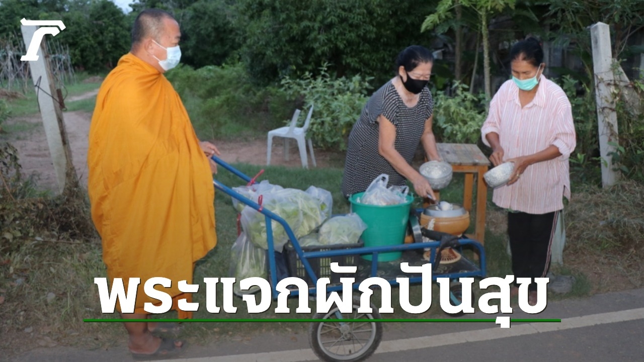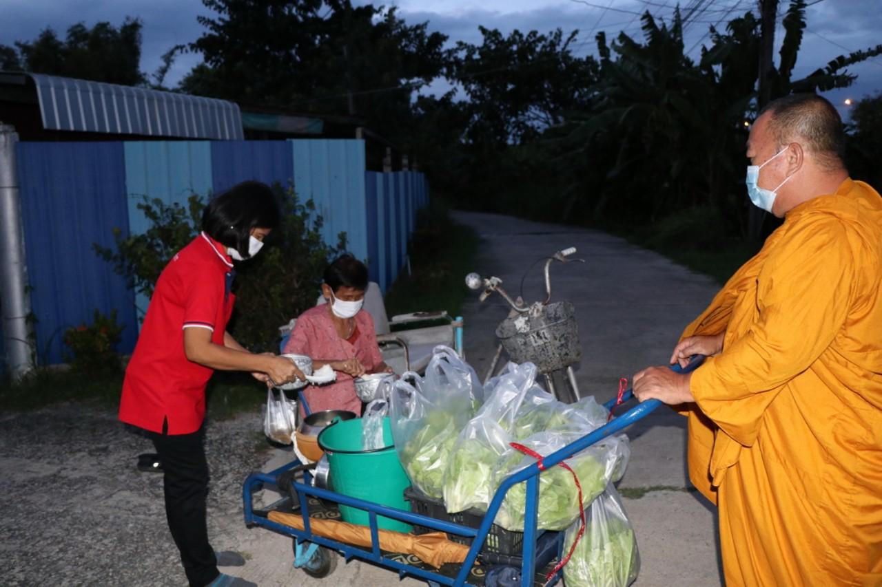 หลังจากญาติโยมทำการตักบาตร พระให้ศีลให้พรแล้ว พระก็จะนำผักสดนานาชนิดที่ปลูกเอง ส่งให้ญาติโยม แบ่งปันความสุข แจกจ่ายให้แก่ชาวบ้าน มานานกว่า 2 ปีแล้ว ประกอบกับช่วงโควิด-19 ระบาด ทางวัดก็ได้ปลูกผักเพิ่มเติม เพื่อให้ประชาชนผู้ที่ได้รับผลกระทบ บางวันก็ มีญาติโยมเดินทางมารับผักเองที่วัดถึงแปลงผัก เพื่อนำไปรับประทานกันภายในครอบครัว ลดค่าใช้จ่าย และในตอนเช้าพระสงฆ์ก็จะใช้รถเข็นที่เตรียมออกบิณฑบาต นำผักใส่รถเต็มคันรถแล้วเข็น ออกบิณฑบาตในตอนเช้า พร้อมนำผักแจกจ่ายปันสุขให้แก่ประชาชนในหมู่บ้านต่อไป.