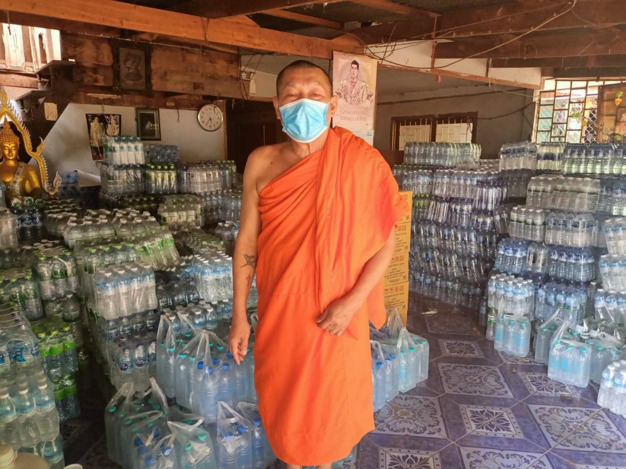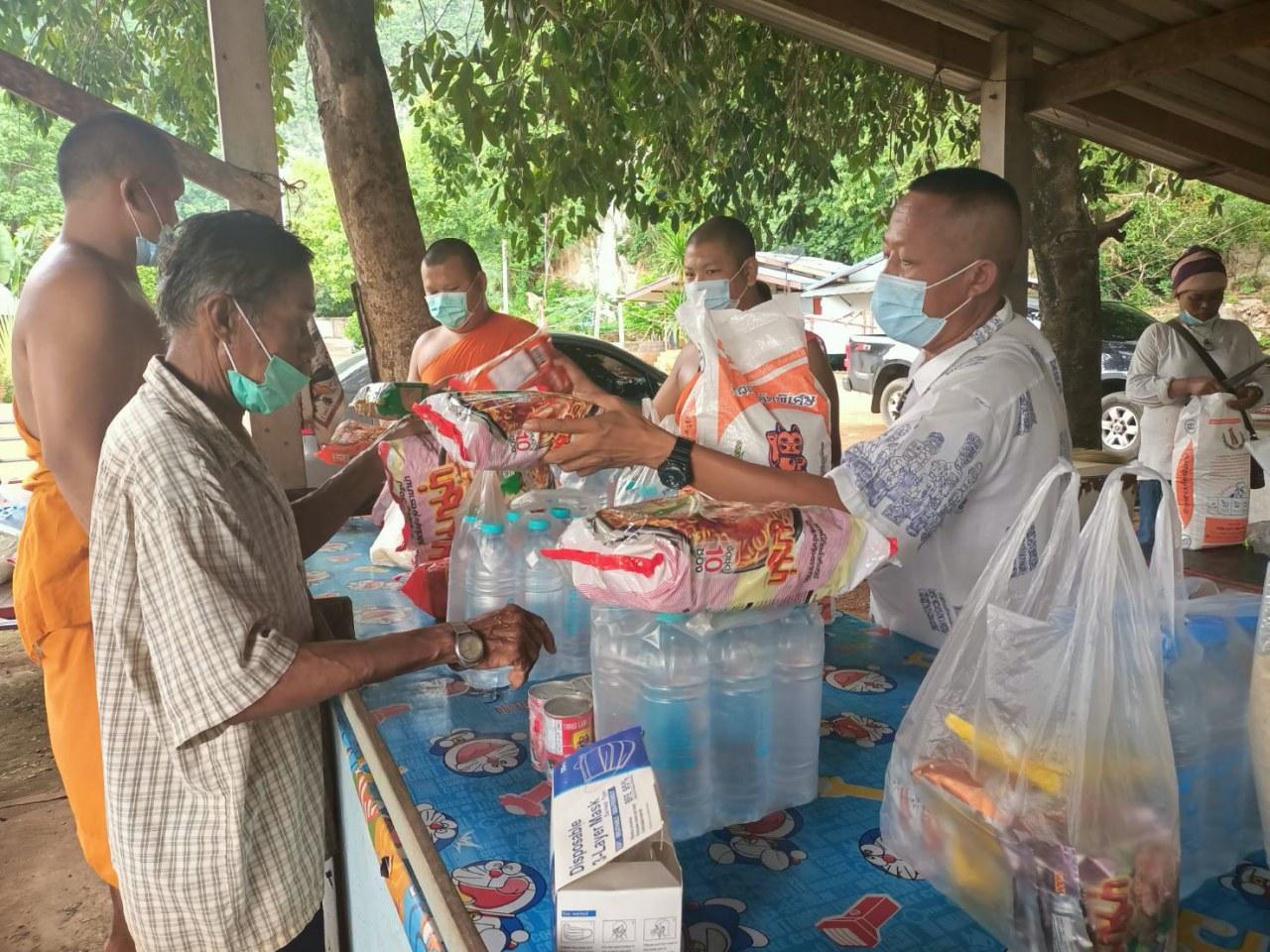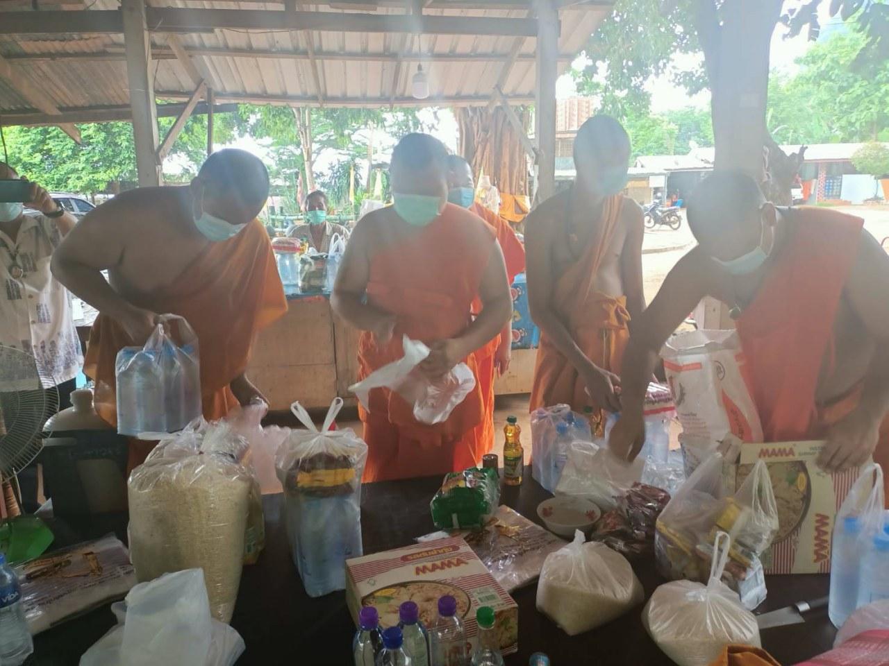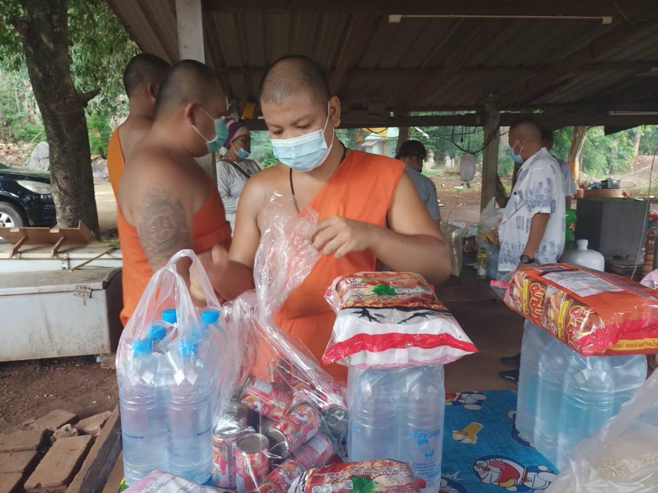 สำหรับของแห้ง เช่น น้ำดื่ม ข้าวสาร และปลากระป๋องนั้นมีญาติโยมส่งมาบริจาคให้เยอะมากในตอนนี้ จนล้นทางวัดก็ทำการให้พระและชาวบ้านนั้นมาแพ็กของใส่ถุงพลาสติก เพื่อนำไปช่วยเหลือญาติโยมในหมู่บ้านต่อไป เพื่อให้ผู้ที่โดนผลกระทบกับโควิดในครั้งนี้ได้ผ่านพ้นไปด้วยดี และหากหมู่บ้านละแวกใกล้เคียงนั้นยังขอทางวัดมาก็ยินดีเป็นอย่างมาก และจะนำไปให้เพื่อเป็นการช่วยเหลือชาวบ้านกันไป ซึ่งในตอนนี้ก็มีญาติโยมนั้นถวายอาหารสดมาทางชาวบ้านญาติโยมผู้หญิง ที่เว้นจากการทำไร่นาก็มาช่วยทางวัด นำปลาสดมาทำตากแห้งเพื่อไว้ให้พระนั้นเก็บไว้ฉันได้นานๆ อีกด้วย.