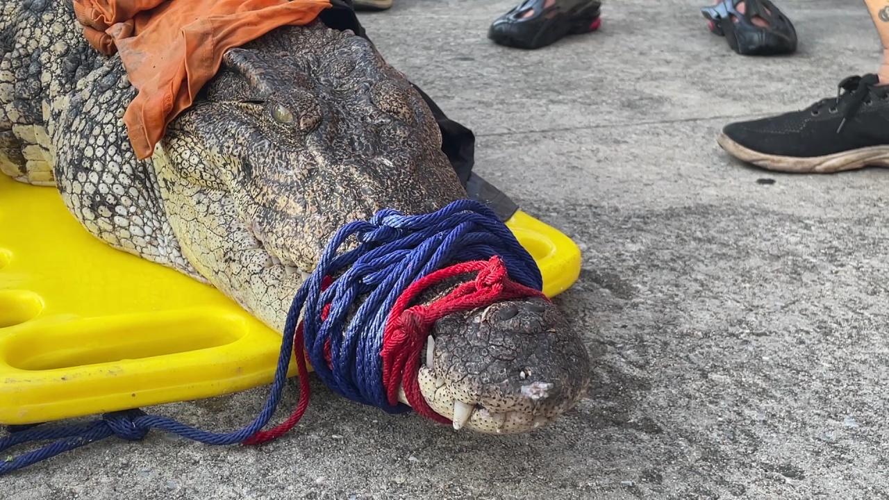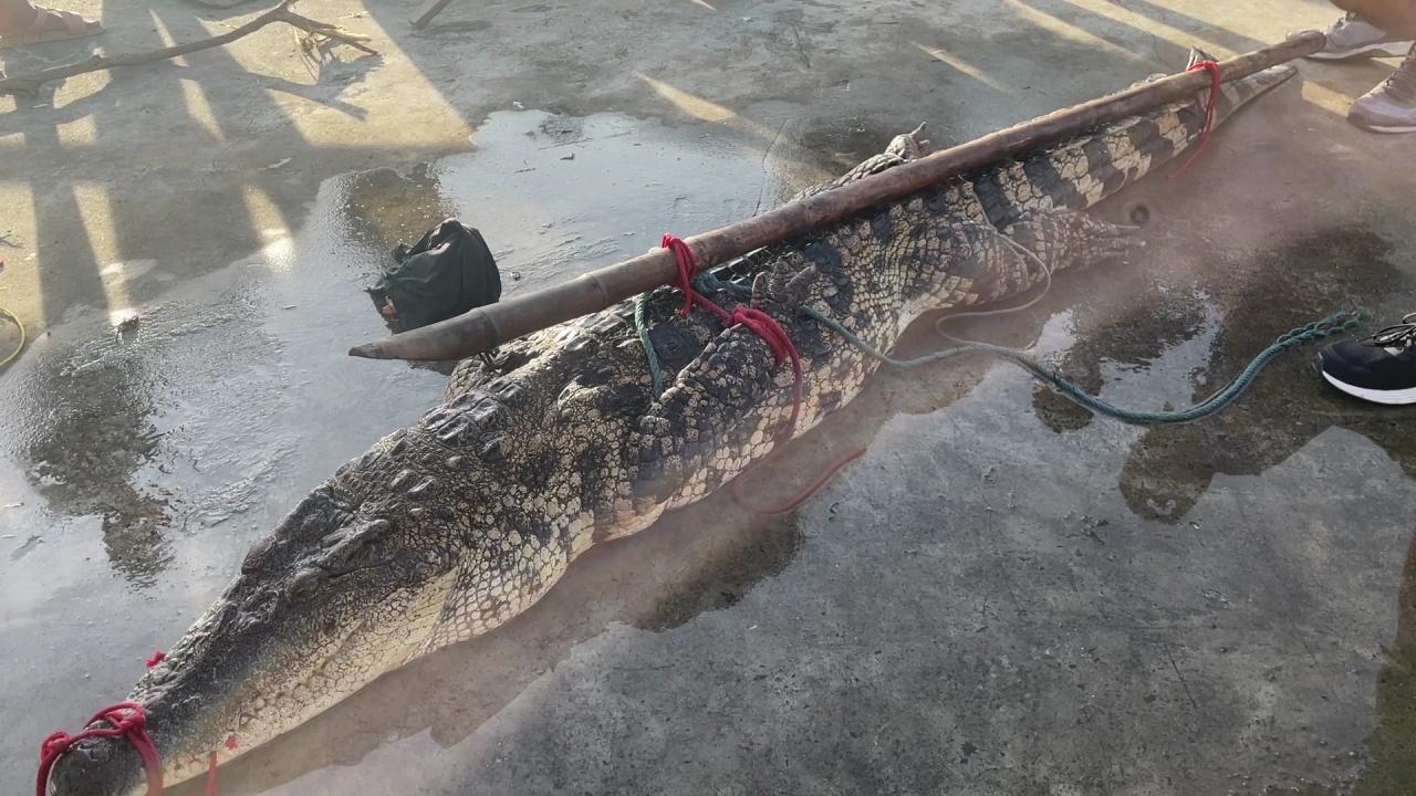 โดยเมื่อเจ้าหน้าที่ไปถึง พบจระเข้ขนาดใหญ่ ถูกมัดมือมัดเท้า นอนอยู่บริเวณท่าน้ำ เจ้าหน้าที่จึงนำจระเข้ขึ้นสไลด์บอร์ด ก่อนวัดความยาวของจระเข้ตัวนี้ ยาวถึง 2.64 เมตร น้ำหนักประมาณ 100 กิโลกรัม ก่อนนำขึ้นรถพาจระเข้ไปยังหน่วยกู้ภัย