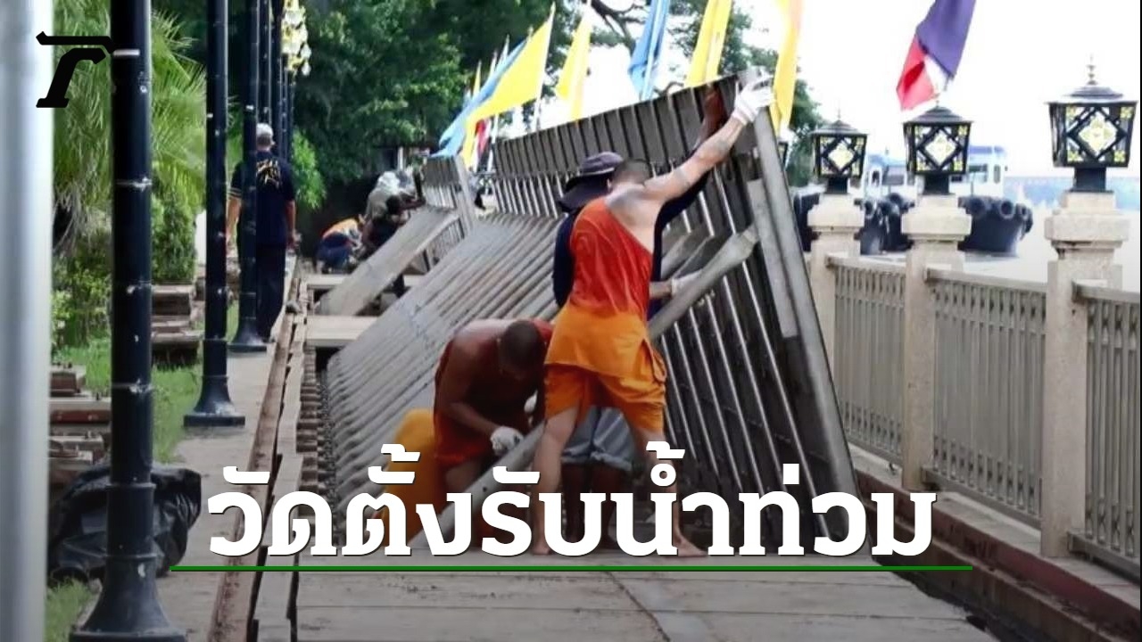 พระลูกวัดของวัดพนัญเชิงฯ พระนครศรีอยุธยา เร่งยกแผงเหล็กทำเขื่อนชั่วคราว หลังแม่น้ำเจ้าพระยาเพิ่มสูงขึ้นอย่างต่อเนื่อง เพื่อป้องกันน้ำทะลักเข้าวัด โดยเป็นระบบแบบเดียวกับโบราณสถานวัดไชยวัฒนาราม