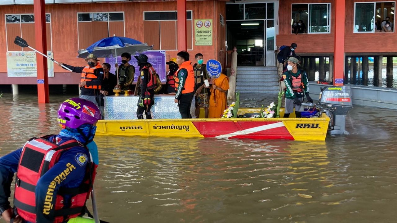แต่ยังโชคยังดีที่ศาลาการเปรียญของวัดยกสูงเหนือน้ำ ญาติโยมที่ได้รับผลกระทบจากน้ำท่วมได้มาอยู่อาศัยอยู่ที่ศาลาวัด พร้อมใช้ประกอบพิธีตามศาสนาตามปกติ ซึ่งวันนี้มีการเผาศพนางทองสุข ทำพิธีทางศาสนาบนศาลาการเปรียญเรียบร้อยแล้ว ถึงเวลาเคลื่อนศพสู่เมรุเพื่อทำการเผา โดยเจ้าหน้าที่มูลนิธิร่วมกตัญญูได้เคลื่อนศพลงเรือไปยังเมรุ ที่น้ำท่วมสูงกว่า 2 เมตร ท่ามกลางฝนที่โปรยปรายลงมา