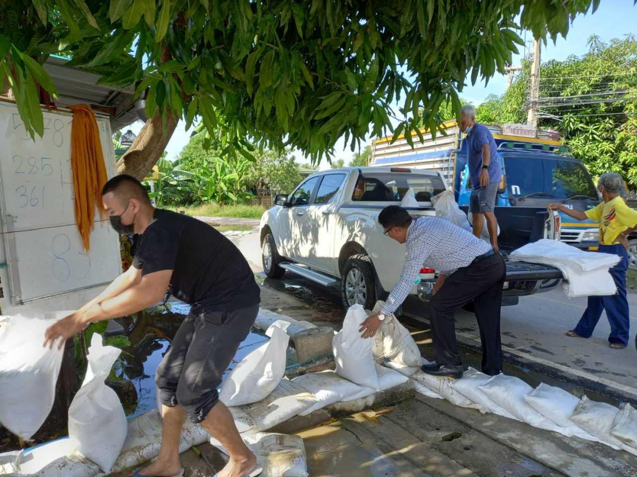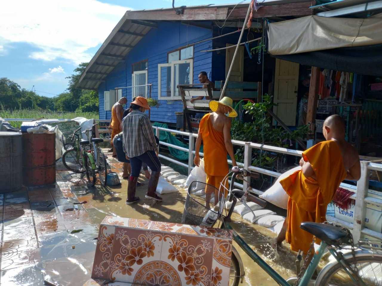 ด้าน ผอ. โรงเรียนวัดดงตาล พระสงฆ์สามเณรวัดดงตาล อ.สองพี่น้อง ช่วยกันนำกระสอบทรายกั้นน้ำที่กำลังทะลักไหลเข้าท่วมวัด โรงเรียน และบ้านเรือนของชาวบ้าน.