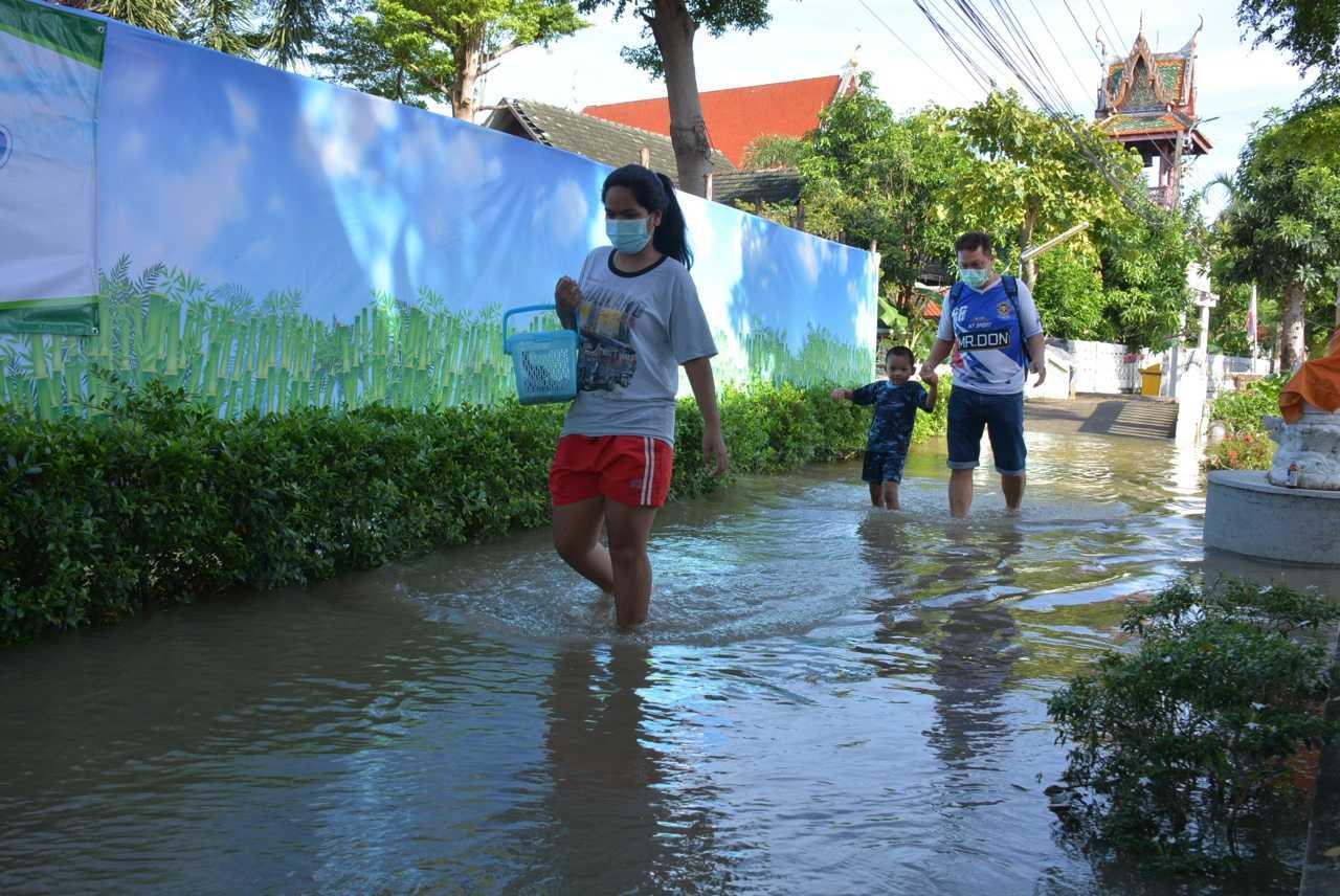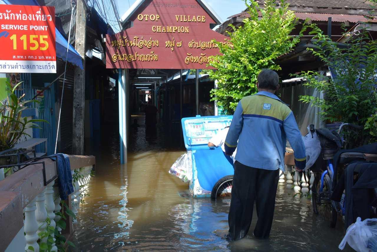 เกาะเกร็ดน้ำท่วมเป็นวันที่ 2 ทั้งชุมชน และวัดเก่าแก่ ได้รับผลกระทบน้ำท่วมสูง 30-80 ซม. ขณะที่การสัญจรเข้าออกบ้านก็ทำได้ลำบาก ขณะที่วัดฉิมพลีกระทบหนัก พระต้องอุ้มบาตรลุยน้ำออกจากวัดแบบทุลักทุเล