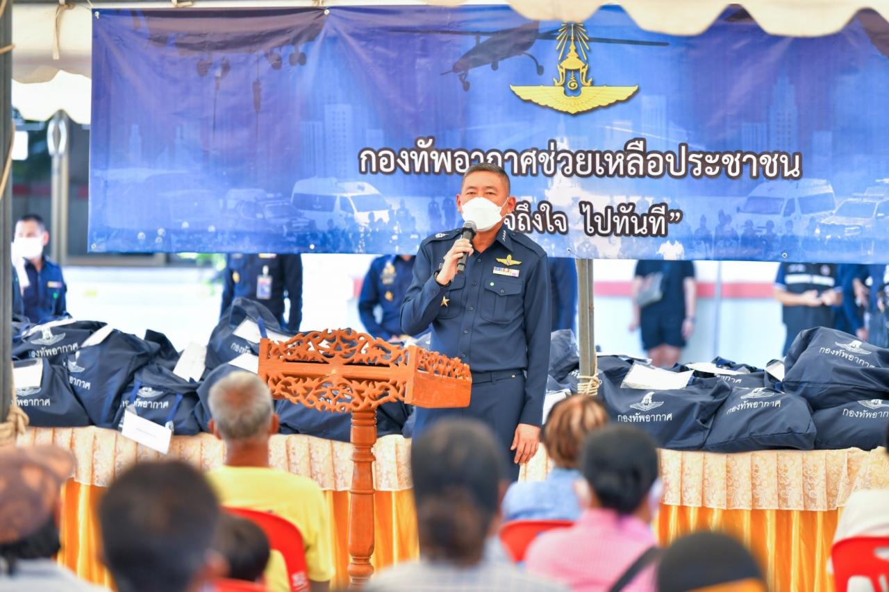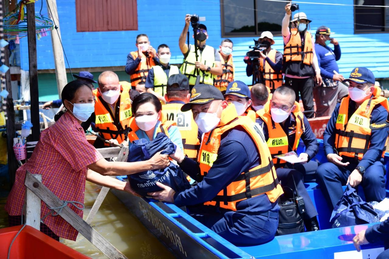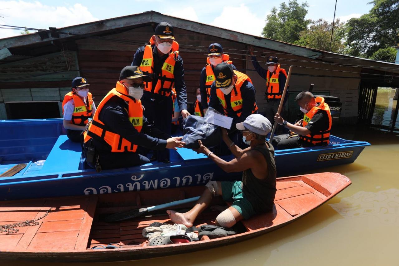 ในโอกาสนี้ ผบ.ทอ. และคณะฯ ได้มอบถุงยังชีพ จำนวน 500 ชุด ให้แก่ประชาชนที่ได้รับผลกระทบจากอุทกภัย พร้อมจัดเลี้ยงอาหารกลางวัน ณ องค์การบริหารส่วนตำบลรางจรเข้ จากนั้นได้ลงเรือเพื่อนำถุงยังชีพไปมอบให้แก่ประชาชนที่บ้านเรือนยังอยู่ในพื้นที่น้ำท่วมสูง สัญจรไปมาลำบาก จำนวน 10 หลังคาเรือน และถวายถุงยังชีพแด่พระภิกษุสงฆ์ ณ วัดกระโดงทอง