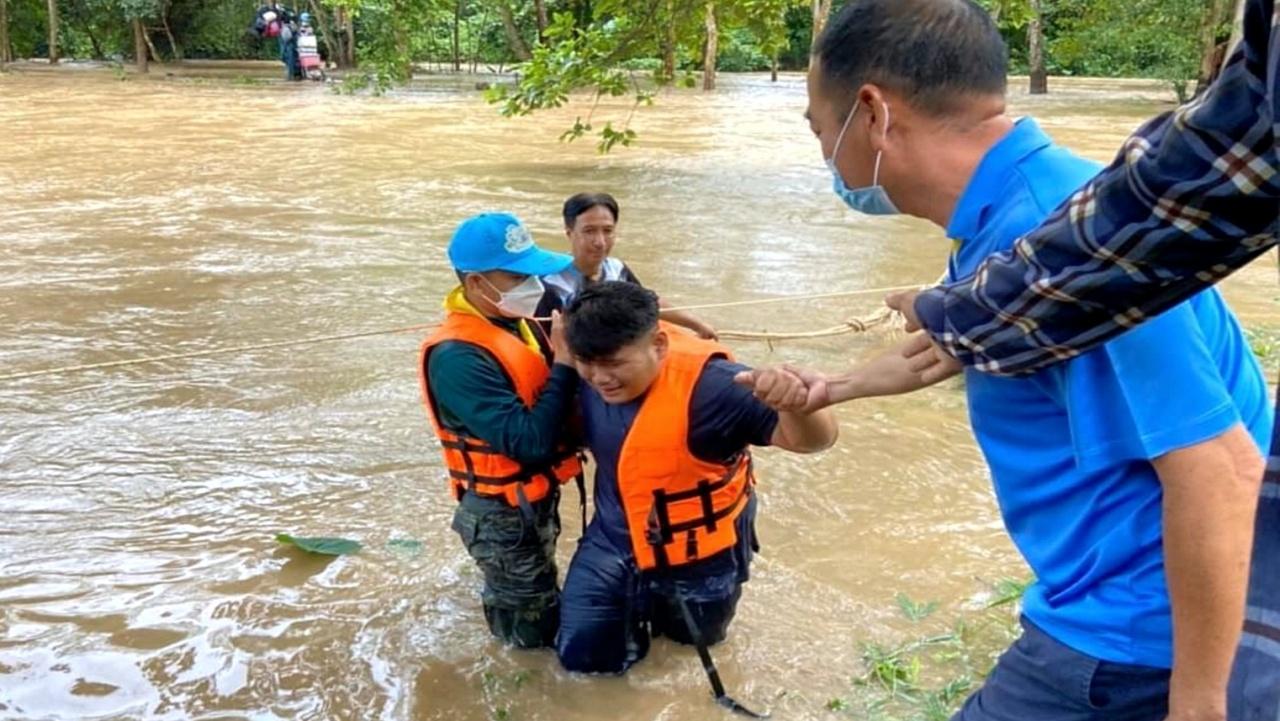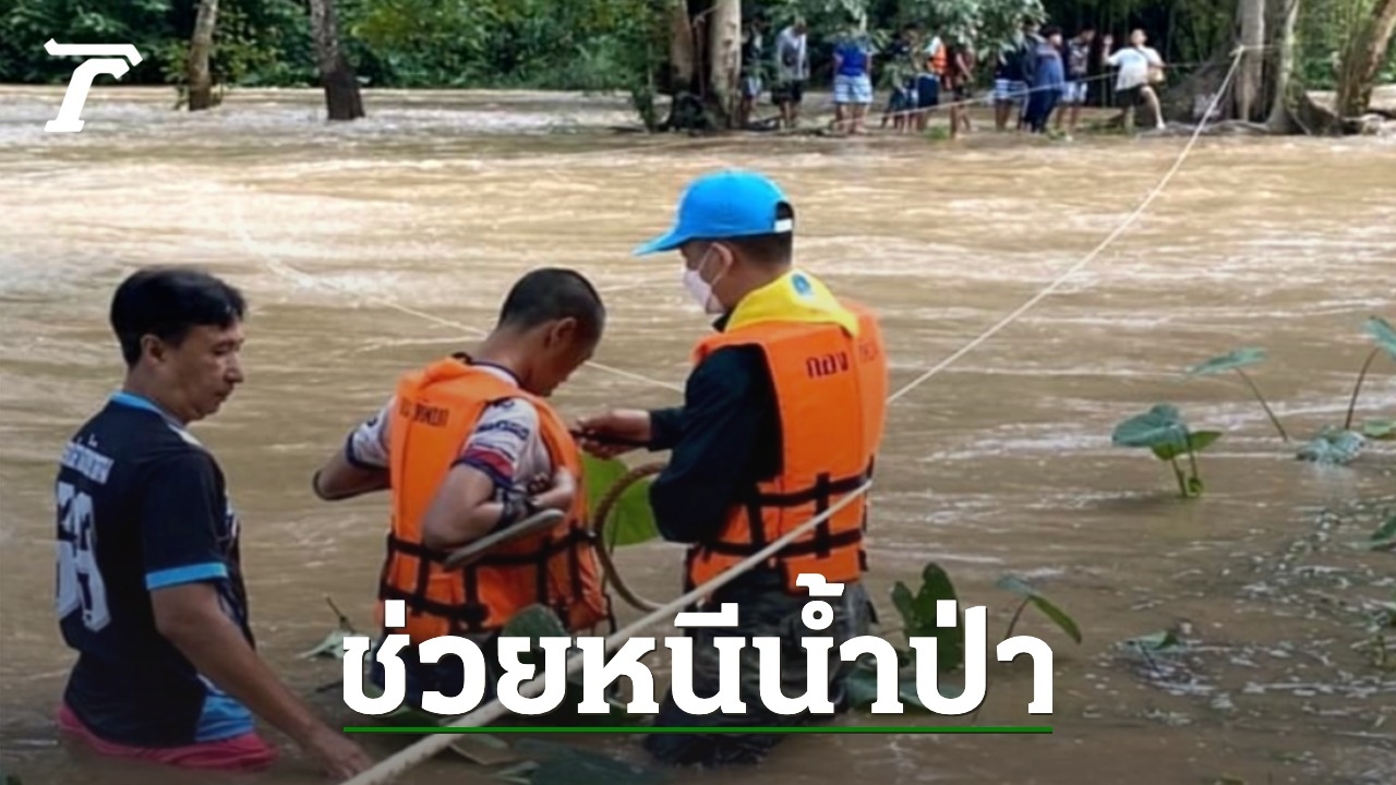 เจ้าหน้าที่เข้าช่วยเหลือ 23 นักท่องเที่ยวกางเต็นท์นอนที่สวนผึ้ง ราชบุรี หลังมีน้ำป่าไหลหลากลงมาจากเทือกเขาตะนาวศรีกลางดึก ใช้เชือกผูกพาไต่ข้ามมาทีละคนจนปลอดภัย