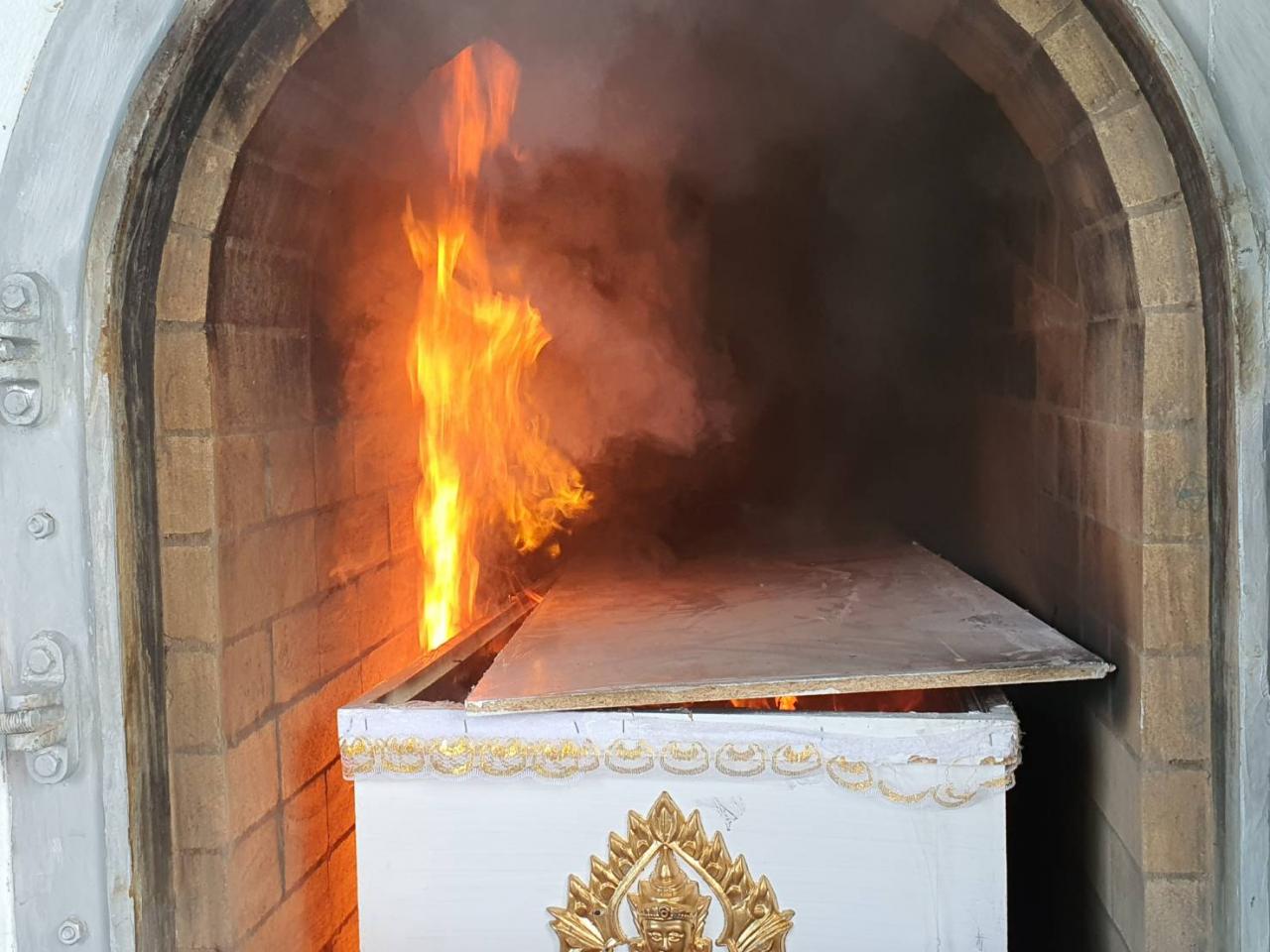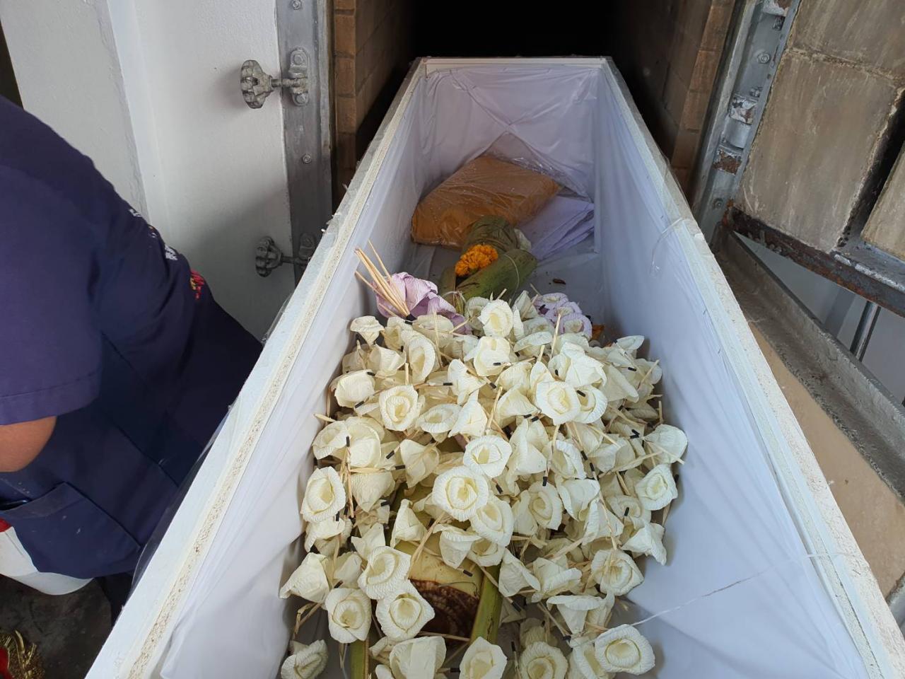 ซึ่งหลังจากพระและชาวบ้านวางดอกไม้จันทน์เสร็จ สัปเหร่อเผาเข้าเตาเผาซึ่งมีทั้งเสียงพระและชาวบ้านขานเลข "124" ดังลั่น ซึ่งเป็นเลขอายุผีคุณกล้วย หลังจากนั้นสัปเหร่อได้ยกโลงเข้าเตาเผาจุดไฟ