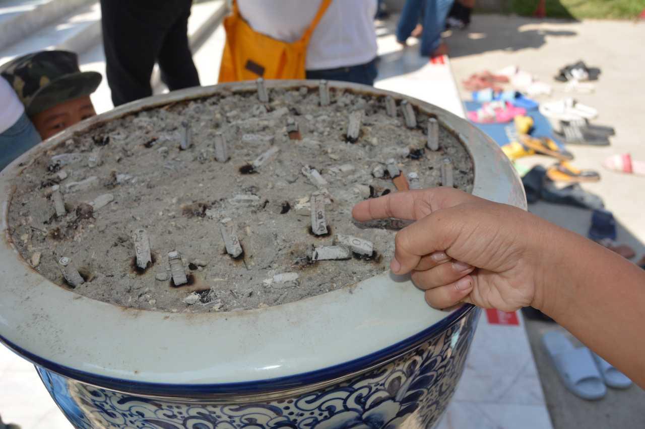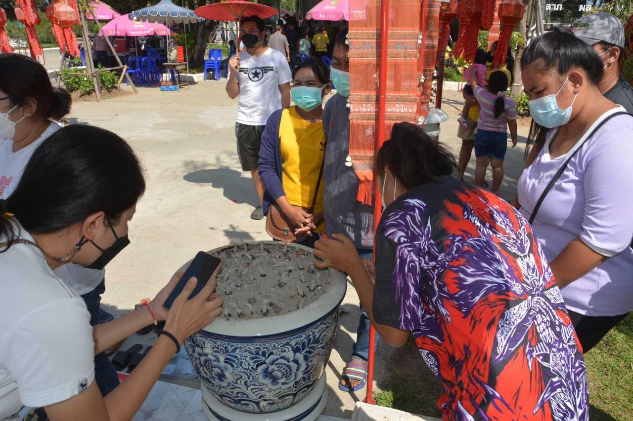 โดยที่กระถางธูปตัวเลข นักเสี่ยงดวง ต่างจุดธูปบูชาท้าวเวสสุวรรณ และยืนเฝ้ารอจนตัวเลขขึ้นครบ 3 ตัว ต่างเฝ้ารออย่างใจจดใจจ่อ โดยมีตัวเลขที่ปรากฏ ก็จะใช้โทรศัพท์ถ่ายภาพ ตัวเลขเก็บไว้และส่งให้เพื่อนๆ และญาติๆ ได้ดูตีตัวเลขเพื่อเสี่ยงดวง ส่วนที่ถังเซียมซีถังยักษ์ ขนาดใหญ่ ซึ่งต้องใช้ความสามัคคีของผู้ต้องการตัวเลข 5-6 คน ช่วยกันแบกเขย่าถังเซียมซี ซึ่งมีประชาชนเดินทางมาจาก จ.กาญจนบุรี มาร่วมมือกันเขย่า ได้เลข 3-6 ก่อนจะหาซื้อลอตเตอรี่เสี่ยงโชคต่อไป ซึ่งในช่วงปีใหม่นี้ ทางวัดพังม่วงได้ทำปฏิทินท้าวเวสสุวรรณ แจกจ่ายสาธุชน ที่มาไหว้ขอพรเพื่อความเป็นสิริมงคลด้วย.