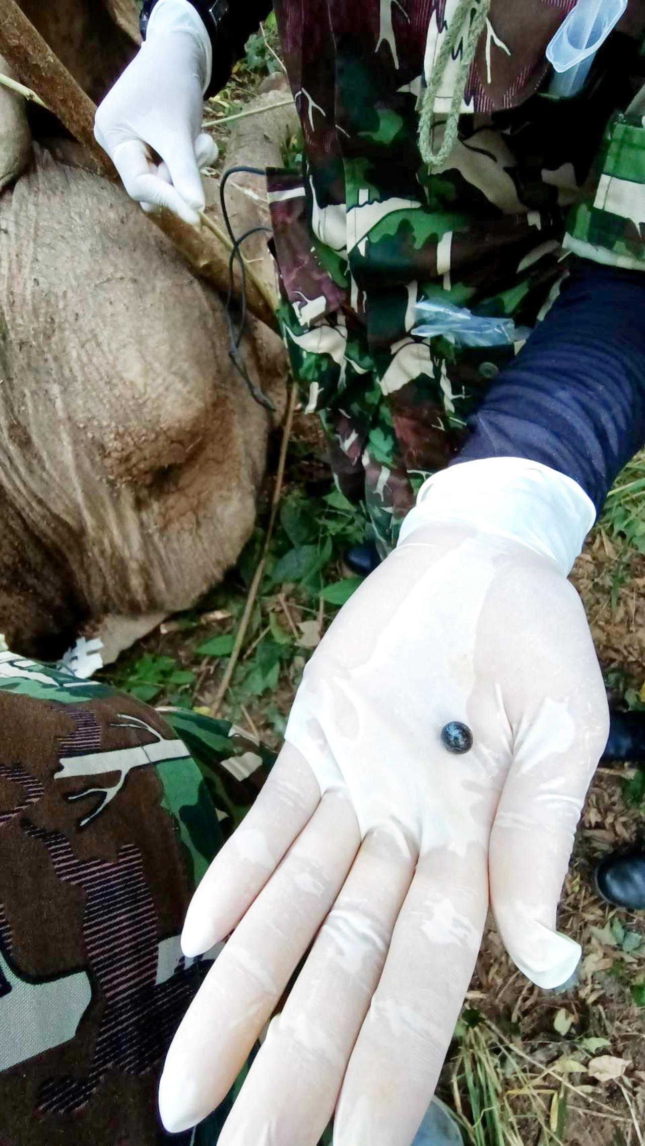 ช้างป่าได้ล้มตัวลงนอนกับพื้นในลักษณะที่หัวต่ำกว่าตัว เสี่ยงต่อภาวะสำลักและอาจมีภาวะอื่นๆ แทรกซ้อนตามมา จึงให้ยาปฏิชีวนะ ยาบำรุง สารน้ำ และยากำจัดปรสิต ซึ่งบาดแผลของช้างที่พบมีหนองข้น ไหลออกจากด้านหลังทั้งสองแผล เป็นโพรงเข้าไปถึงชั้นกล้ามเนื้อ ลึกประมาณ 2-3 ฟุต ซึ่งคาดว่าเป็นรอยจากการต่อสู้ ส่วนแผลที่บริเวณหัวและบริเวณกลางลำตัว ตรวจด้วยเครื่องตรวจโลหะ พบว่ามีโลหะอยู่ภายในบาดแผลทั่วทั้งร่างกาย โดยทีมสัตวแพทย์ได้ล้างแผลและนำกระสุนออก เป็นกระสุนปืนลูกซองขนาด 9 จึงเก็บเป็นหลักฐานเข้าแจ้งความ เพื่อหาตัวคนกระทำผิดมาดำเนินคดีต่อไป.