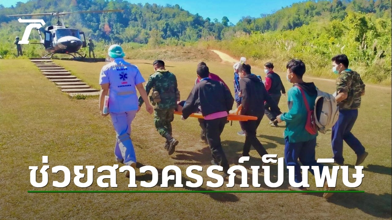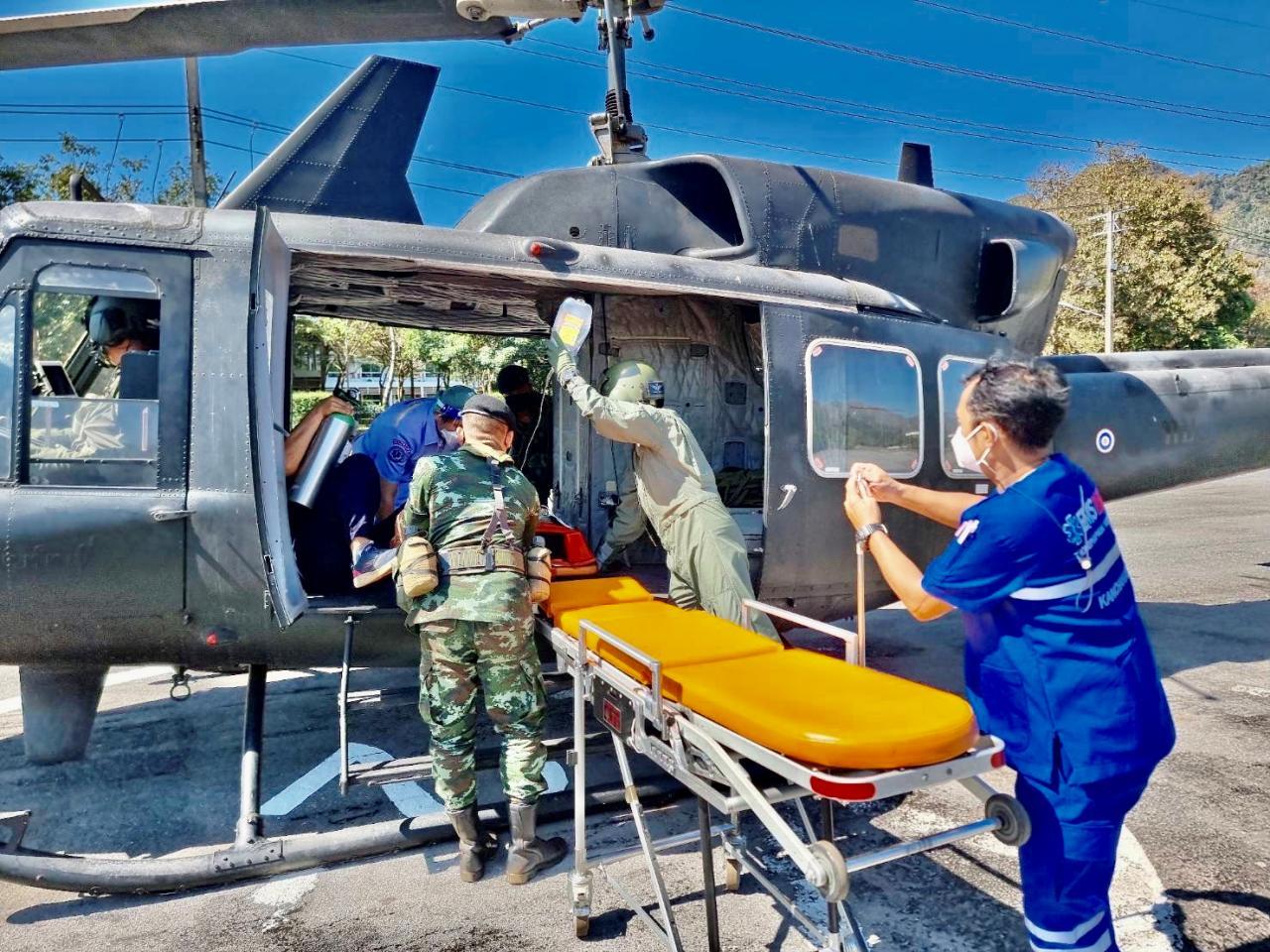 เมื่อวันที่ 26 ม.ค.65 พลตรีบรรยง ทองน่วม ผบ.พล.ร.9 ในฐานะ ผบ.กกล.สุรสีห์ ได้รับการประสานงาน จึงร่วมกับ กระทรวงสาธารณสุข และสถาบันการแพทย์ฉุกเฉินแห่งชาติ (สพฉ.) ขอสนับสนุน จัดอากาศยาน ฮ.ท.212 จำนวน 1 เครื่อง ร่วมกับทีมแพทย์ฉุกเฉิน Sky Doctor รพ.ทองผาภูมิ เพื่อทำการช่วยเหลือเคลื่อนย้ายผู้ป่วยฉุกเฉิน จำนวน 1 ราย ผู้ป่วยหญิง อายุ 20 ปี ซึ่งกำลังตั้งครรภ์ 35 สัปดาห์ มีภาวะครรภ์เป็นพิษ มีอาการชักเกร็ง และหมดสติ