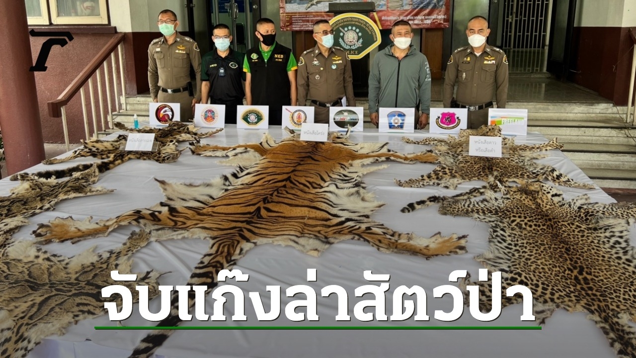 รอง ผบ.ตร. พร้อมอธิบดีกรมอุทยานฯ แถลงโชว์ผลงาน ตร.ปทส. ทลายแก๊งล่าสัตว์ป่า และนำซากของสัตว์ป่าคุ้มครองโดยไม่ได้รับอนุญาตเข้ามาจำหน่าย พร้อม 3 ผู้ต้องหา และของกลางลูกแมวดาว หนังเสือพันธุ์ต่างๆ