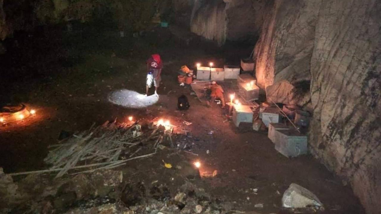 เจ้าหน้าที่ จาก 2 มูลนิธิต้องสนธิกำลังนำอุปกรณ์การช่วยเหลือเดินขึ้นภูเขาที่มีระยะทางกว่า 3 กม.ไปยังจุดเกิดเหตุที่มีต้นไม้ขึ้นหนาทึบท่ามกลางบรรยากาศเริ่มมืดค่ำ พบว่าที่ปากปล่องภูเขามีการทำบันไดลิงผูกติดไว้เพื่อไต่ลงไปยังพื้นล่างของถ้ำ แต่บันไดตรงกลางขาดหายไป เจ้าหน้าที่ชุดเฉพาะกิจส่วนกลางของมูลนิธิฯ จึงใช้อุปกรณ์ไฟฟ้าส่องสว่าง เครื่องปฐมพยาบาล แล้ใช้เชือกไปผูกติดกับต้นไม้เพื่อไต่โรยตัวลงไปยังพื้นด้านล่างของถ้ำ ซึ่งเป็นห้องโถงขนาดใหญ่ กว้าง 15 เมตร คูณ 20 เมตร