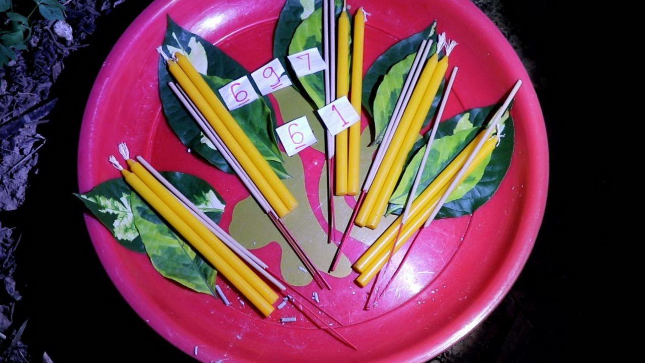นักแสวงโชคมาทำพิธีเลขเสี่ยงทายพญาบึ้ง หลังวัดโบสถ์ราชศรัทธา อ่างทอง ครั้งนี้ขอในตอนเช้า พญาบึ้งนำตัวเลขออกมาเพียบในตอนค่ำ 2 ครั้ง พบเป็นเลขชุด 3 ตัวและ 2 ตัว ได้ไปลุ้นโชคหวังรวยกันต่อไป