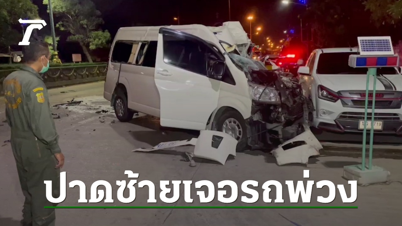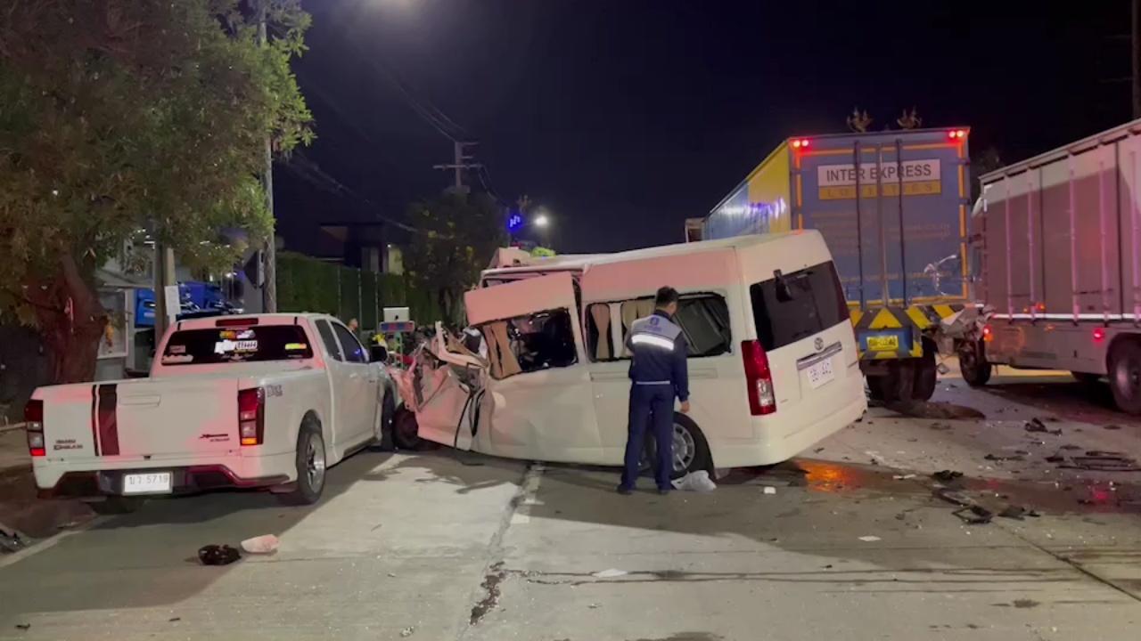 รถตู้เปลี่ยนเลนเข้าซ้ายกะทันหัน พุ่งชนท้ายรถบรรทุกพ่วงที่เปิดไฟผ่าหมากจะเลี้ยวเข้าโรงงานย่านราชาเทวะ อ.บางพลี ยังดีคนขับได้รับบาดเจ็บไม่มาก แค่ดั้งจมูกหัก
