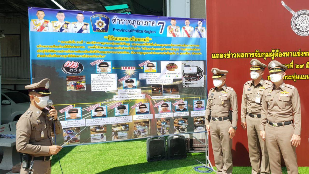 ผบช.ภ.7 แถลงการจับกุมแก๊งรถซิ่งบนถนนพุทธมณฑลสาย 4 กลุ่ม "NA ดิวะ" ที่นัดแข่งรถผ่านแอปฯ ไลน์ ถูก ตร.กระทุ่มแบนดำเนินคดีแล้ว 10 ราย สารภาพ 7 คน สู้คดีในชั้นศาล 3 ราย และรอติดตามตัวอีก 1 ราย